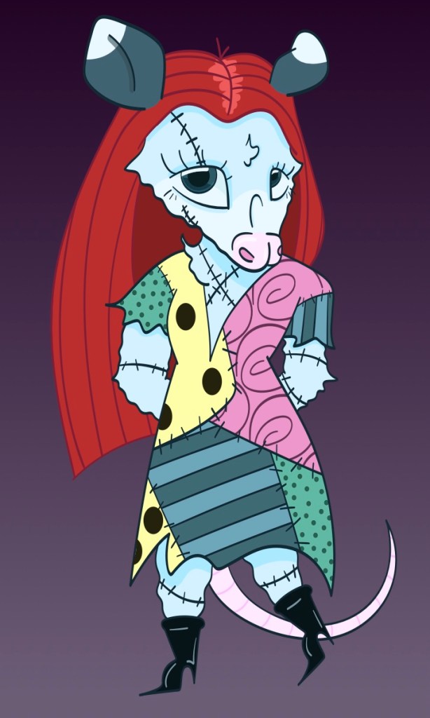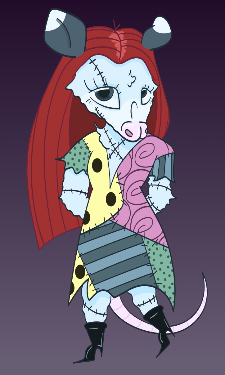 First, we had to choose one of our favorite characters drawn over the semester, so I picked one from a previous assignment where I drew an anthropomorphized human character (original pictured above). I decided to do Sally from The Nightmare Before Christmas because it is a movie that I have always loved for as long as I can remember, and I thought Sally as a possum was just perfect. I knew I wanted to make her look much more possum-like in this project in comparison to the original that I made, as I feel it was sort of giving a mouse more than a possum. To do that I gave her a rounder body and a bigger nose and snout which I feel made a huge difference, but besides that, I kept the design the same and color-dropped all of the colors. The pattern on her dress was definitely the most challenging part of this project because of the patchwork pattern, and the anatomy might not be the most correct, but despite all that, I am really proud of this turnaround and think it taught me a lot about perspective. What do you think?!
