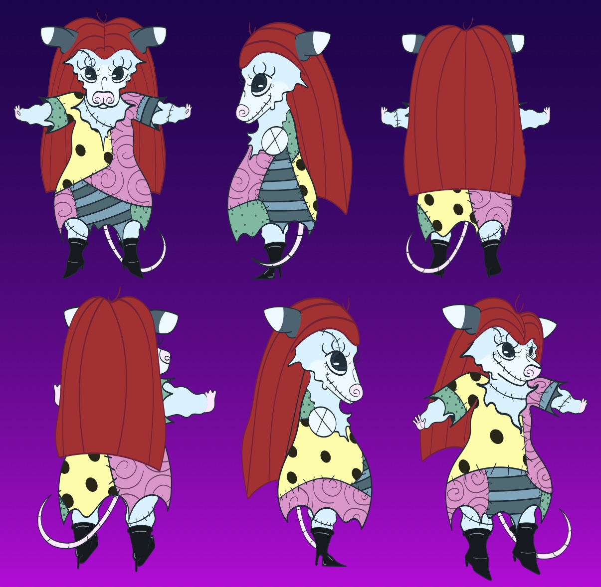 First, we had to choose one of our favorite characters drawn over the semester, so I picked one from a previous assignment where I drew an anthropomorphized human character (original pictured above). I decided to do Sally from The Nightmare Before Christmas because it is a movie that I have always loved for as long as I can remember, and I thought Sally as a possum was just perfect. I knew I wanted to make her look much more possum-like in this project in comparison to the original that I made, as I feel it was sort of giving a mouse more than a possum. To do that I gave her a rounder body and a bigger nose and snout which I feel made a huge difference, but besides that, I kept the design the same and color-dropped all of the colors. The pattern on her dress was definitely the most challenging part of this project because of the patchwork pattern, and the anatomy might not be the most correct, but despite all that, I am really proud of this turnaround and think it taught me a lot about perspective. What do you think?!