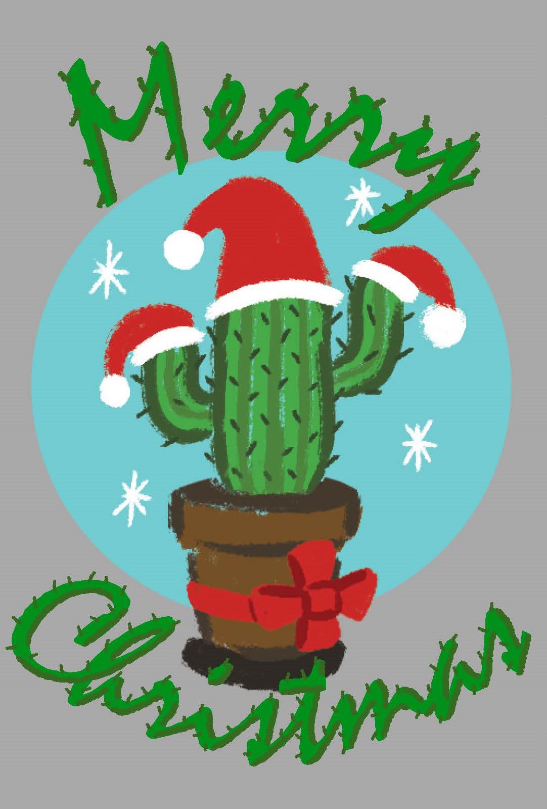 My Christmas card was of a cute cactus with Santa hats on it’s branches. The type I used was a rough handwritten typeface and to create the spikey cactus texture on the lettering I would select the type and expand the image in Adobe illustrator. I would then reselect the type and change the color to green and then with the brush tool I would add shading and thorns to the lettering to complete the cactus look. The cactus was imported from photoshop where I originally drew it. I actually managed to have one of my cards purchased at the Zeta Omicron card an ornament sale which was exciting!