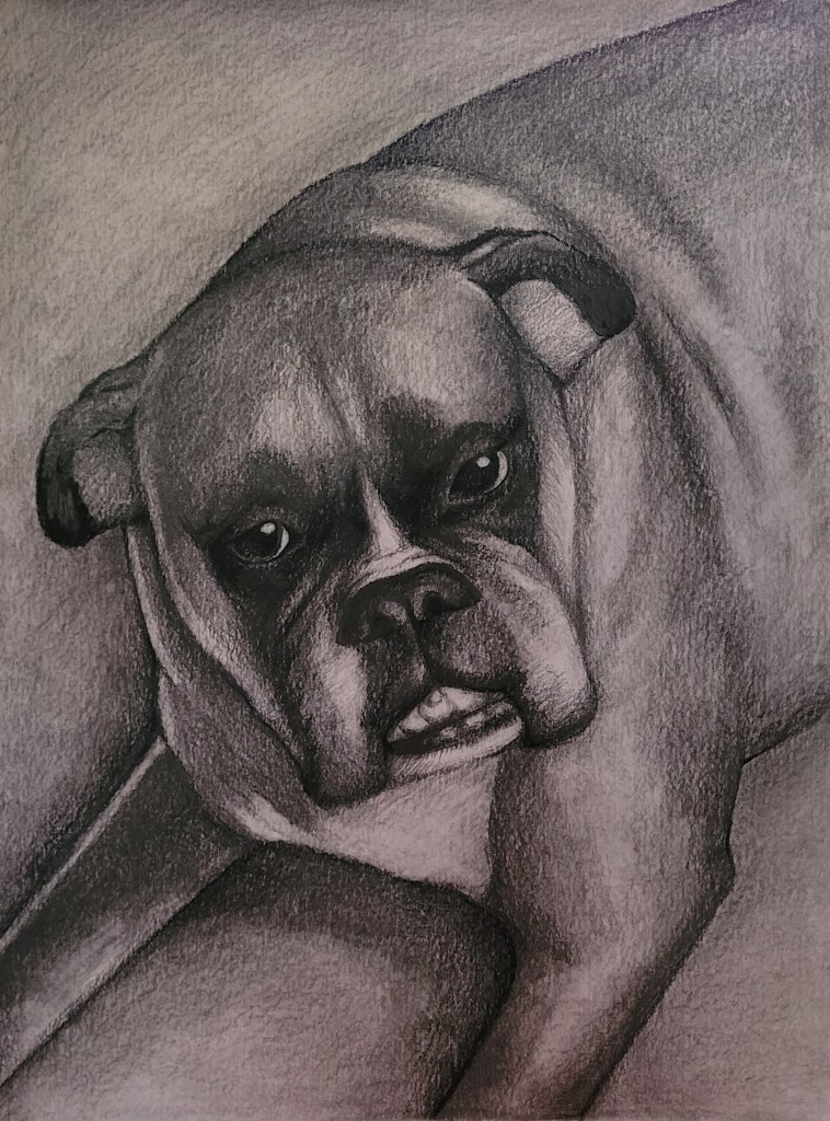 The first present I focused on was a portrait of my friend’s dog who passed away earlier this year. His name was Dunkin and he was such a cutie. He would always greet house guests and give them huge kissies. I chose to mimic this photo because he looks so adorable. I completed it using graphite/pencil. I left most of my art supplies at school over break so I had limited options. But it turned out okay!