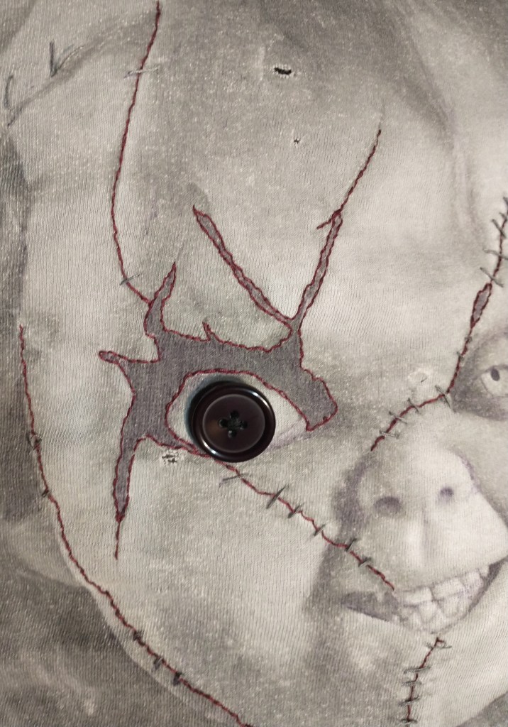 So, I got my sewing kit out and started repairing the rips. (P.S.S. I am not that great at sewing). After that, I wanted to add some more detail to Chucky’s face. So, I started by adding a dark red thread along all of his scars and eye. After that, the staples were all below the scar lines, so I went back in with a dark grey thread and went over all the staples, even a few that are holding his hair.