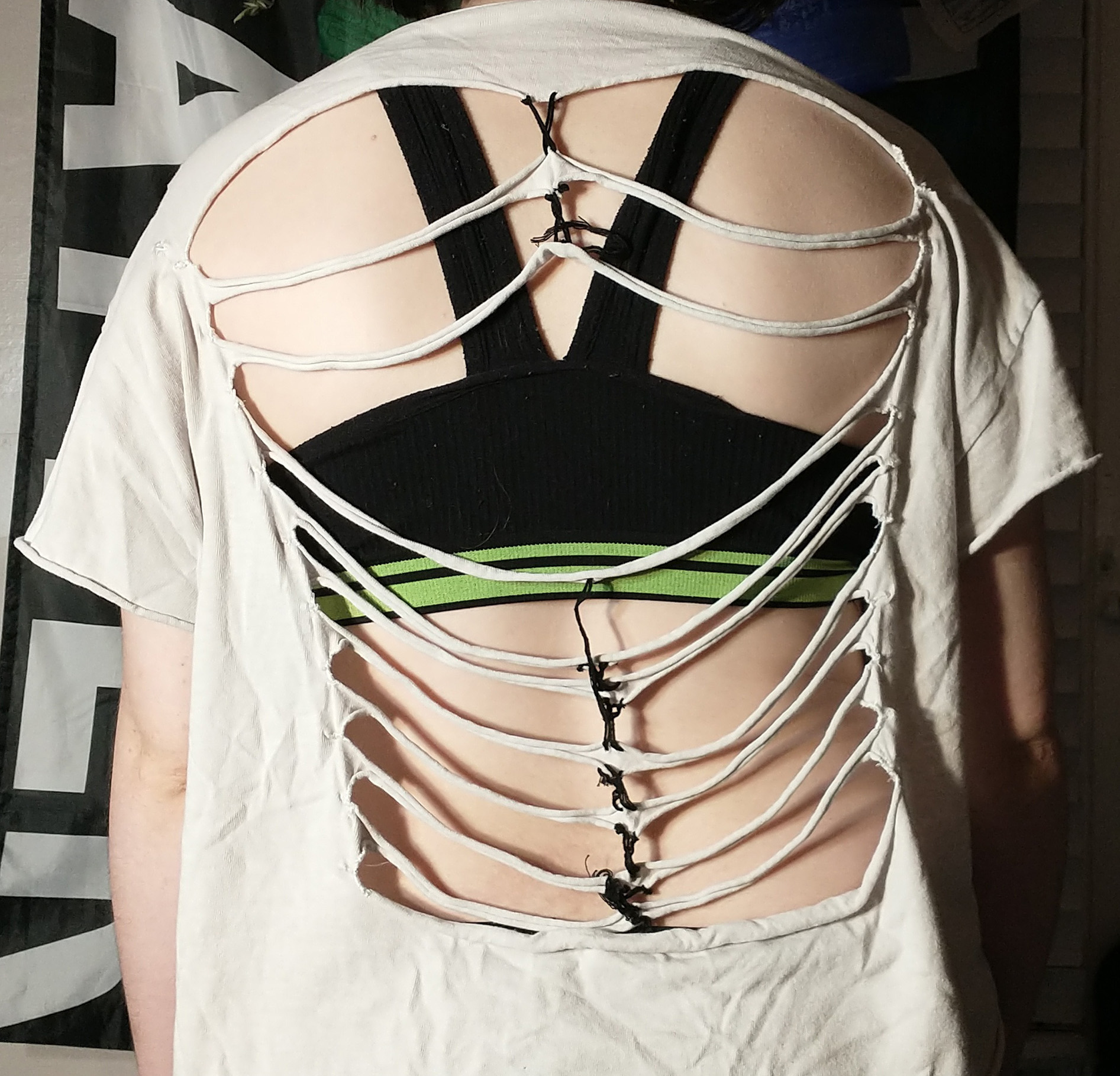 When I first got it, it didn’t fit me and stayed in the bottom of my dresser, till a few years ago when I tried it on again and it finally fit, but, it didn’t look quite right on me. So, I cut it up. I made it a crop top, put horizontal cuts all along the back of it, and put some cuts at the top on the front with some safety pins.