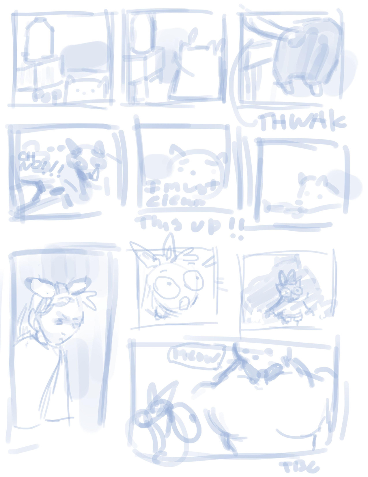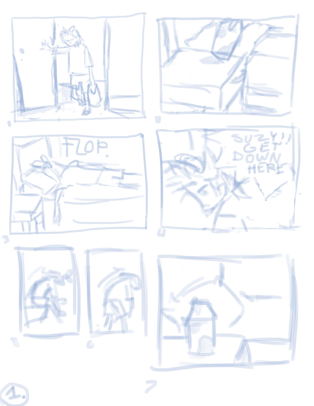 As you can see above, my rough draft was very rough. During the first critique, I received very helpful advice, such as making the final panel its own page!