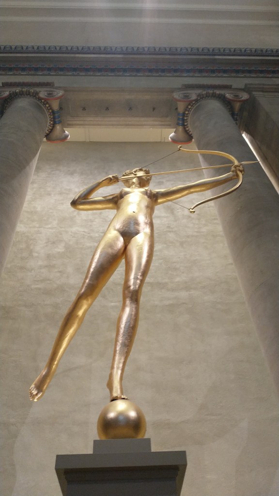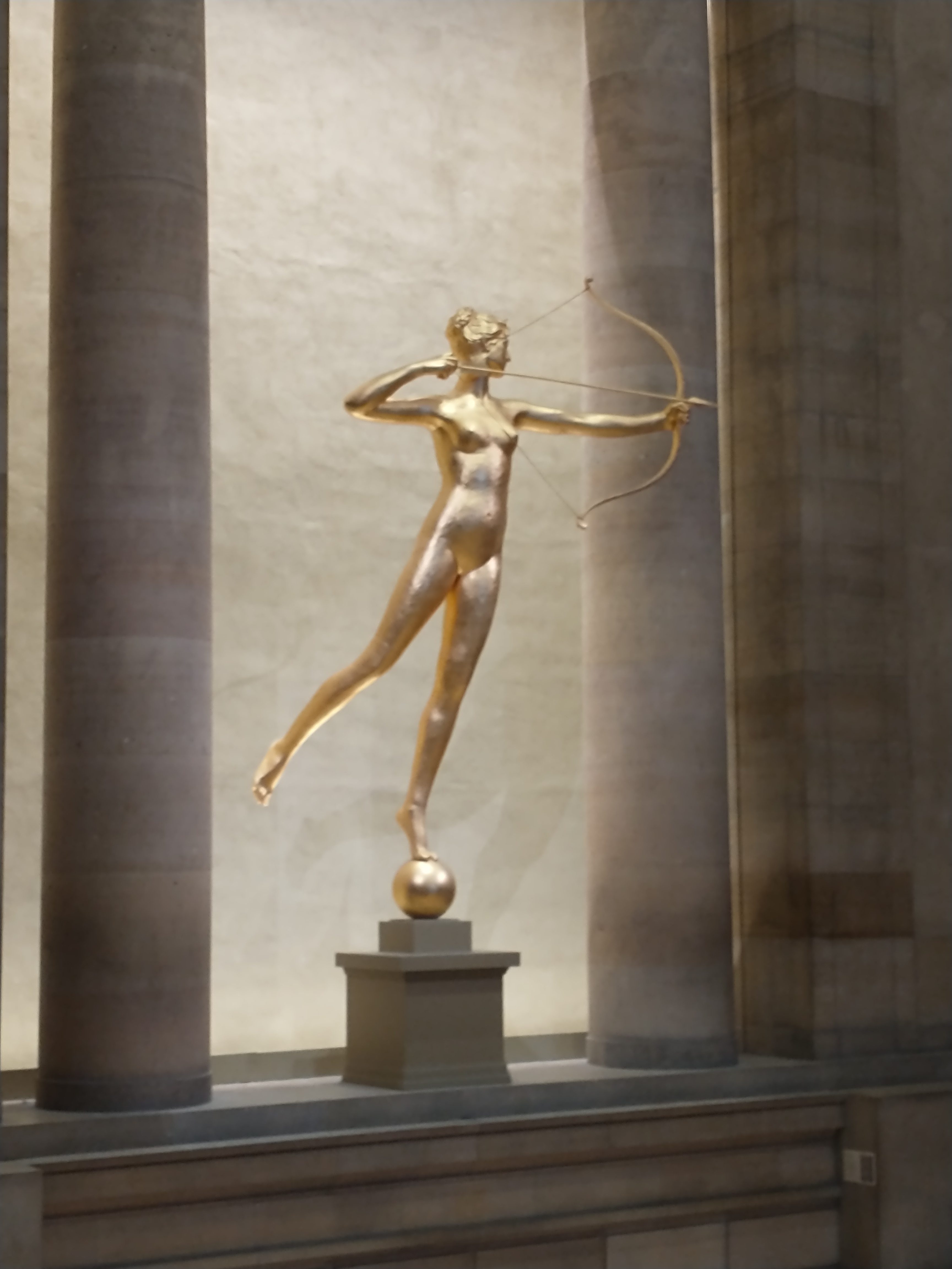 Standing at 13 feet and 1 inch, we have Diana. Made in 1892-93, she is constructed with gilded copper sheets made by Augustus Saint-Gaudens. She is the primary focus when in the Great Stair Hall of the museum. Her size can only make you look at her in awe when walking up the stairs to her. She is grand and beautiful to see. I even picked up a pin of her from the gift shop.