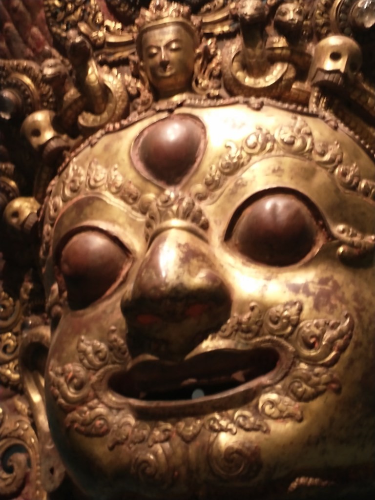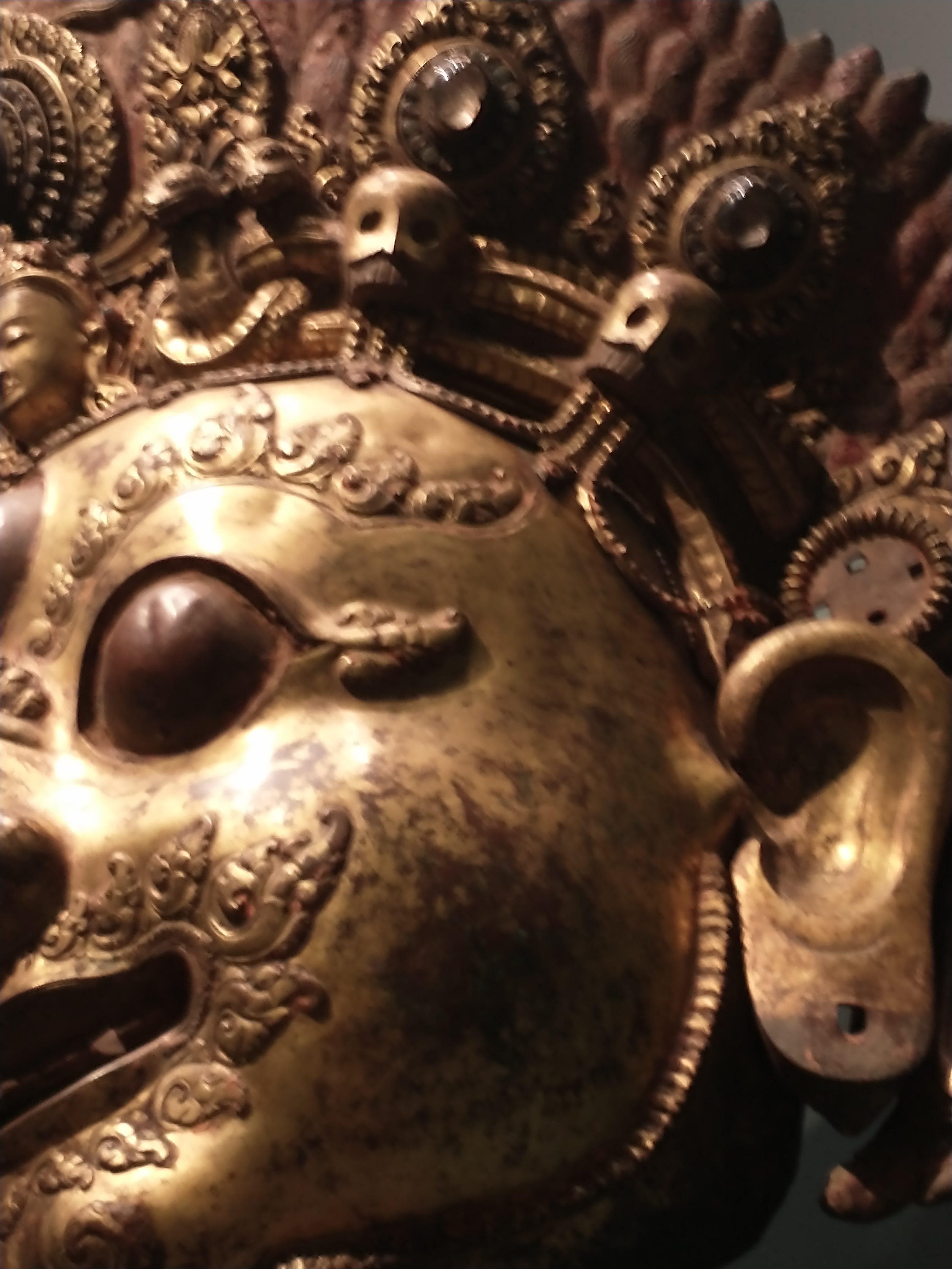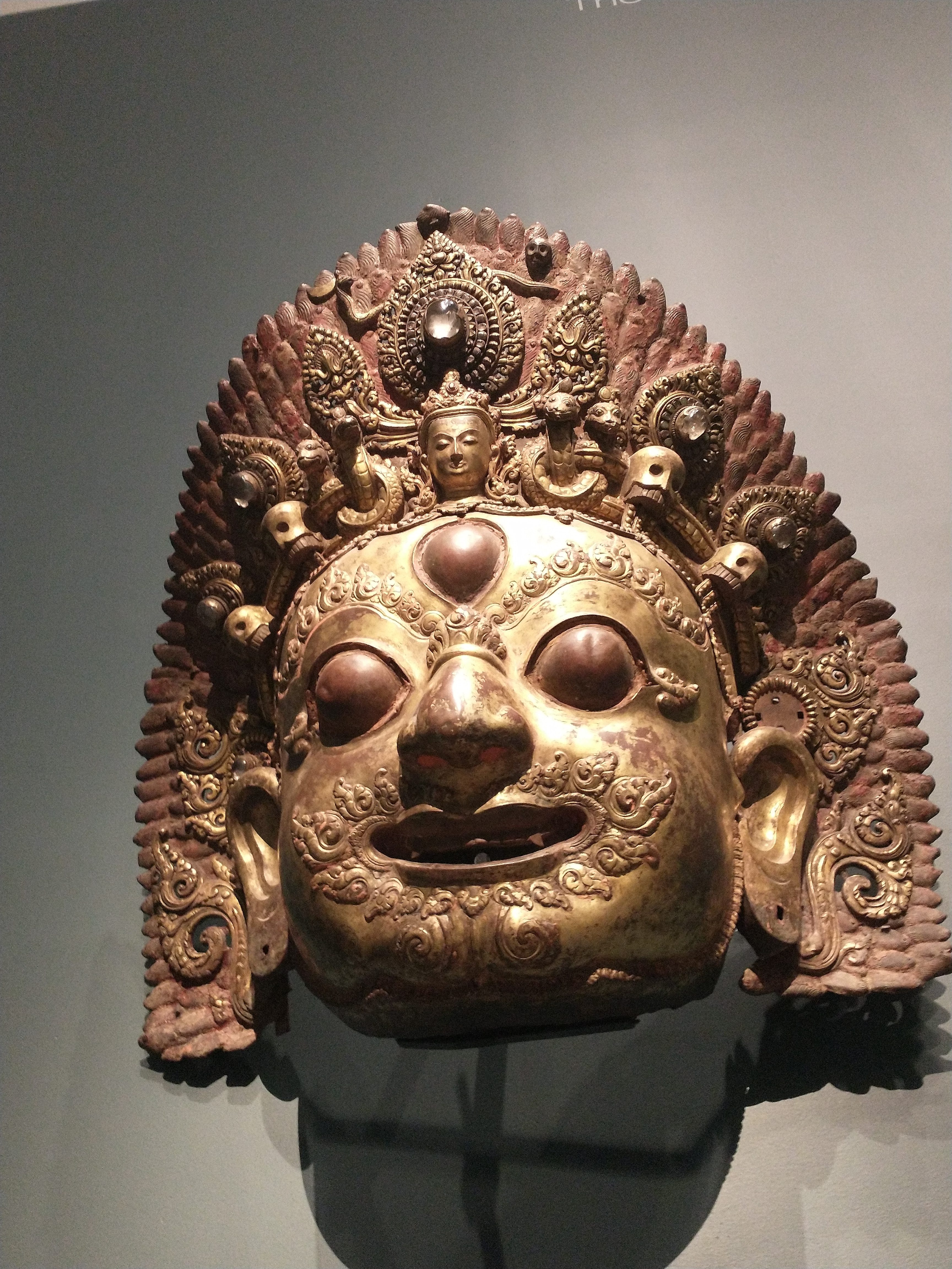 This is the Face of Bhairava. Bhairava is a form of the Hindu god Shiva. The artist is unknown, but it is likely that this, among others, was made for festivals. This most likely was used to pour beer from its mouth for the celebrators to drink from and bring them luck. Both Hindus and Buddhists would use this for celebration. He was placed above a door and was jarring to discover. His head is quite large and looks almost evil from below. He was quite the scare when found.