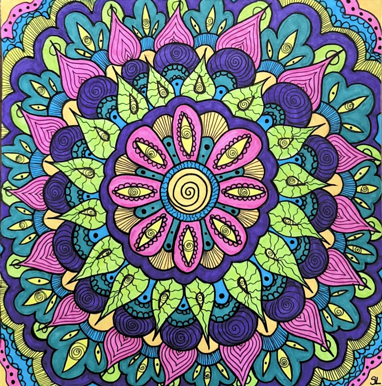 The first thing I visualized when I listened to the second song was a kaleidoscope, with changing colors and shapes. To me, the lyrics were about looking past the expectations of society and doing your own thing. I was sure that I wanted to make a mandala for this song and I picked bolder colors because for me this song was more upbeat and had psychedelic vibes. I just started in the center of the paper and started drawing whatever shapes came to my mind while listening to the song. My favorite part about this piece is the color palette.