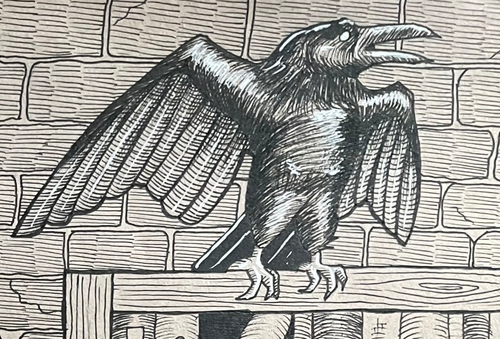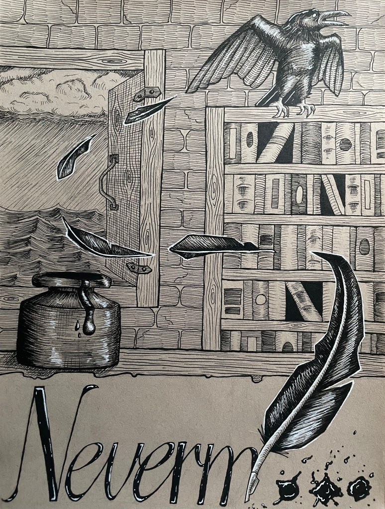 My thought process while drawing this is that I wanted to work with the directionality in my composition to really lead the eye around. The crow to the quill, the rain and choppy waves that makeup part of the background, even the way some of the books lean in the bookcase. My favorite detail actually came from a happy accident! I couldn’t fit the type in “Nevermore,” so I had the text end at the “m” and lead into the quill with ink splotches proceeding after it. It made me feel far more clever than I am.