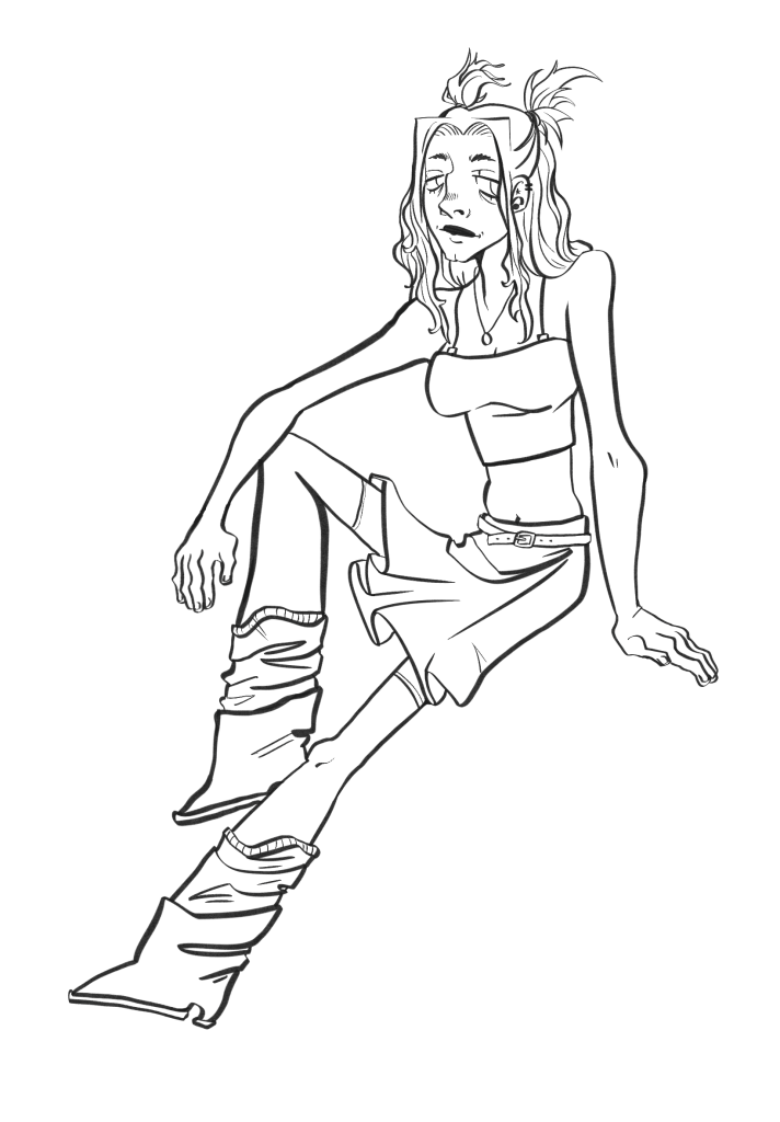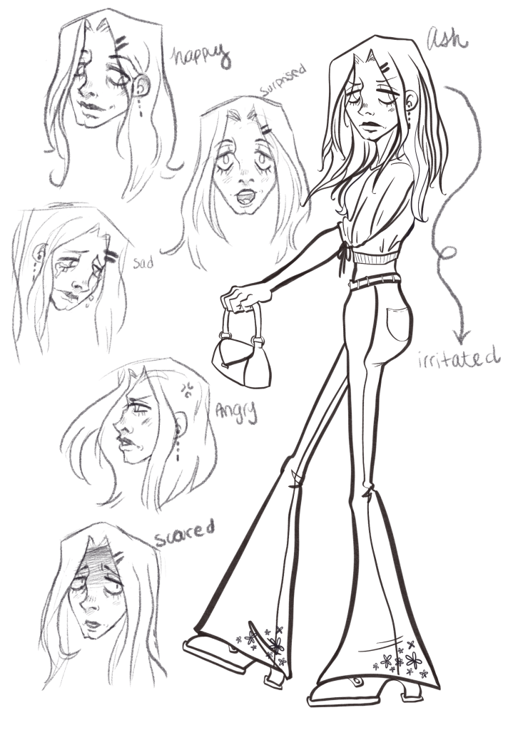 For my story, I decided to embrace the predictable and write about a jaded pop star and an alternative singer that are forced to collaborate on a song together. I wanted the pop star to look casual, but to also show that she was successful in her career. I really wanted to give her more unconventional features, like more of a “butt” chin and a larger nose. I feel like I’ve seen a lot of “cute” art styles on the internet that don’t really allow room for features like that, so I wanted to explore it a bit more. In my initial sketch I wanted to make her have a hairstyle that looked like it came from the early 2000s, however that just made her look way more punk than I had intended. I liked the calves that descended into her feet, although in later designs I found that I just couldn’t make it work.
