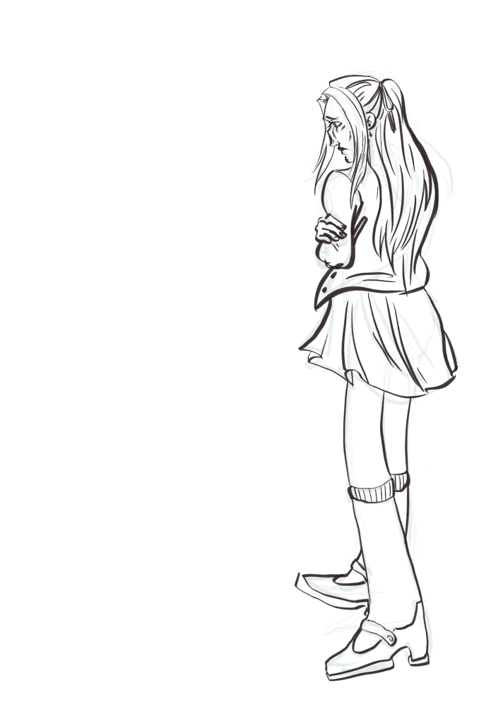 In my last sketch of her, outfit still a work in progress, I have her standing next to the other main character, the alternative singer. I kept the pose similar to the one she was in earlier, I just didn’t ink it yet. I tried giving her a skirt again, although this time I felt that the more form fitted one worked. I really liked how thin and stylized her legs were, and kept them small going downward, but still kept her feet large. I really liked how that looked, and so the design stuck.