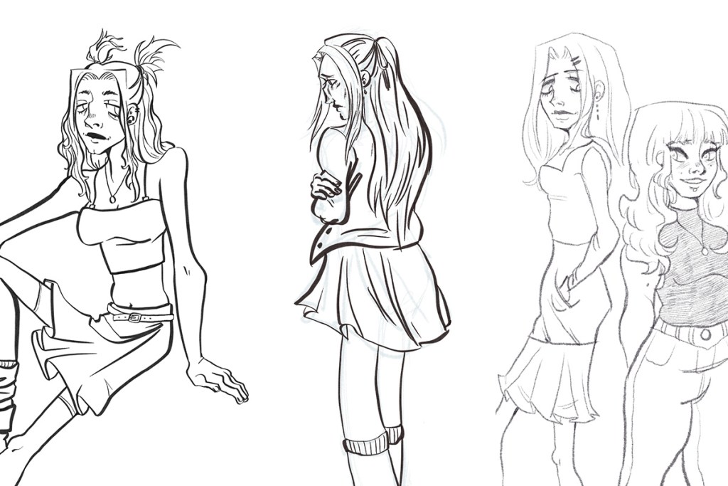 In my last sketch of her, outfit still a work in progress, I have her standing next to the other main character, the alternative singer. I kept the pose similar to the one she was in earlier, I just didn’t ink it yet. I tried giving her a skirt again, although this time I felt that the more form fitted one worked. I really liked how thin and stylized her legs were, and kept them small going downward, but still kept her feet large. I really liked how that looked, and so the design stuck.