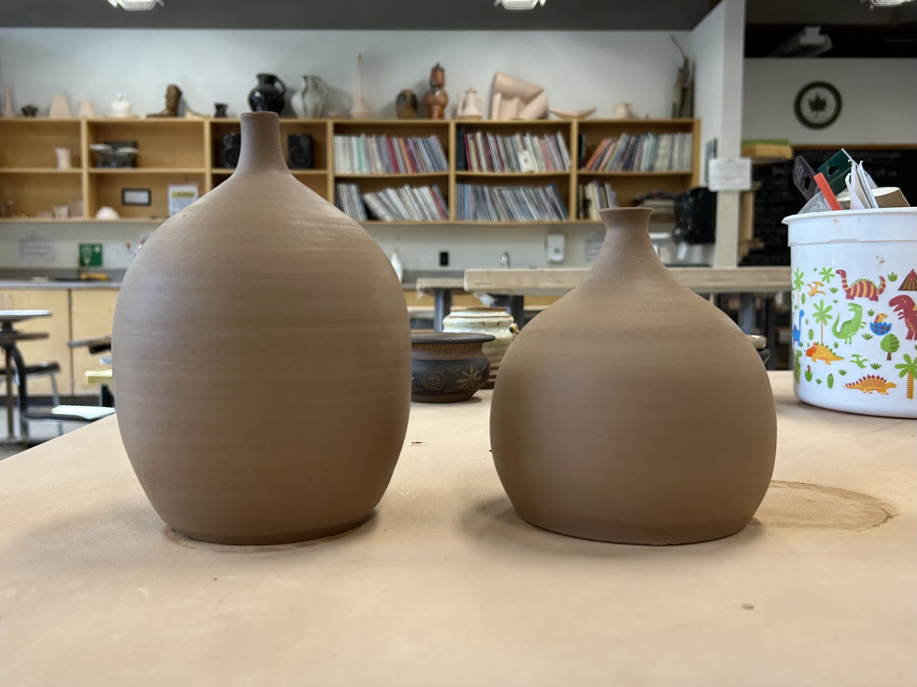 To start, I threw bottle shapes on the wheel. It was a difficult shape to create for me, especially where the top tapers but good learning experience.