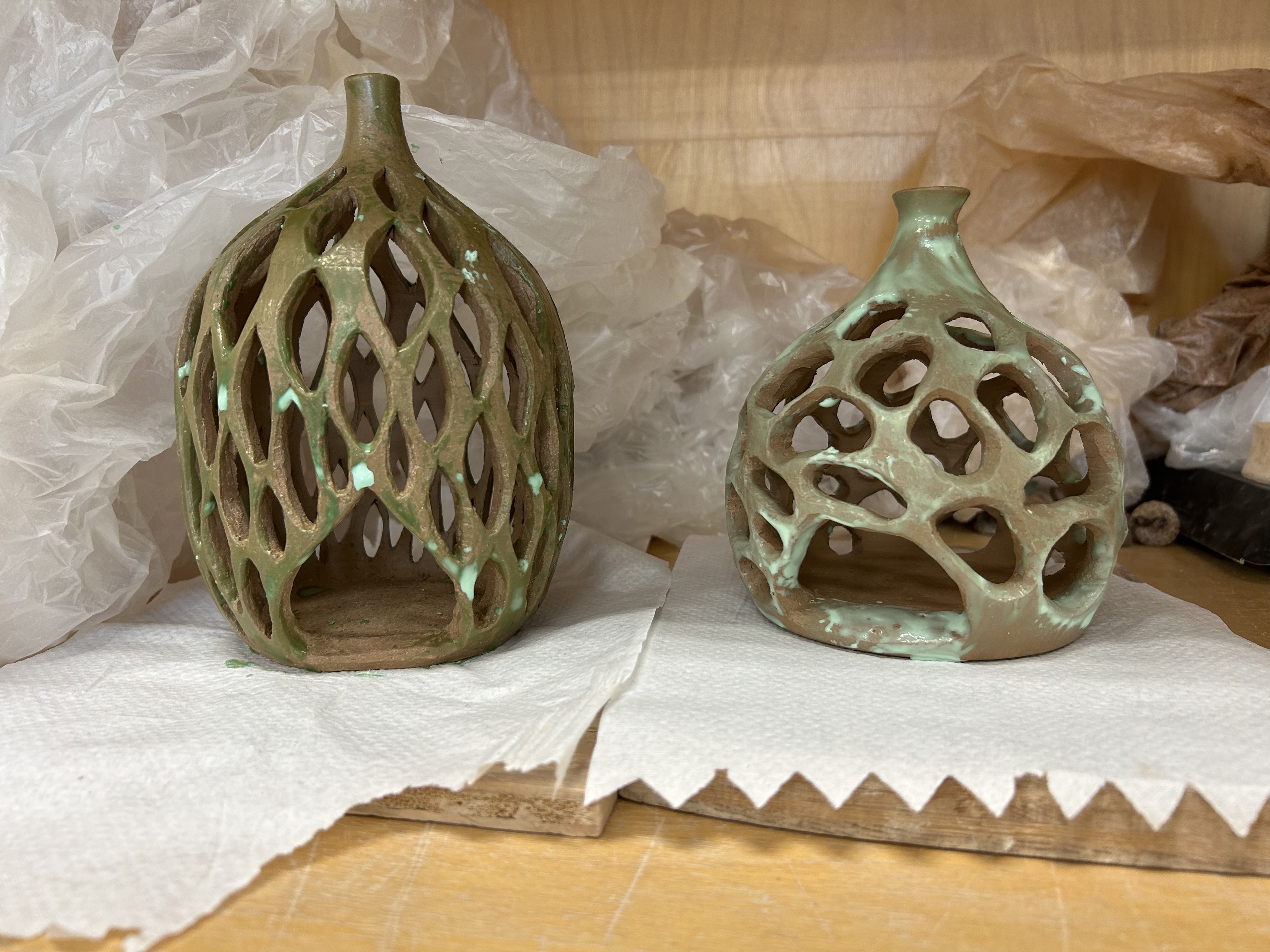 After that, the most important step was to put wax on them so they would dry without cracking because I pushed the clay to the limits with how much I cut out. After that it was a waiting game, hoping they came out of the kiln in one piece. Choosing what glaze is always the hardest decision for me but I am really happy with how they both came out.