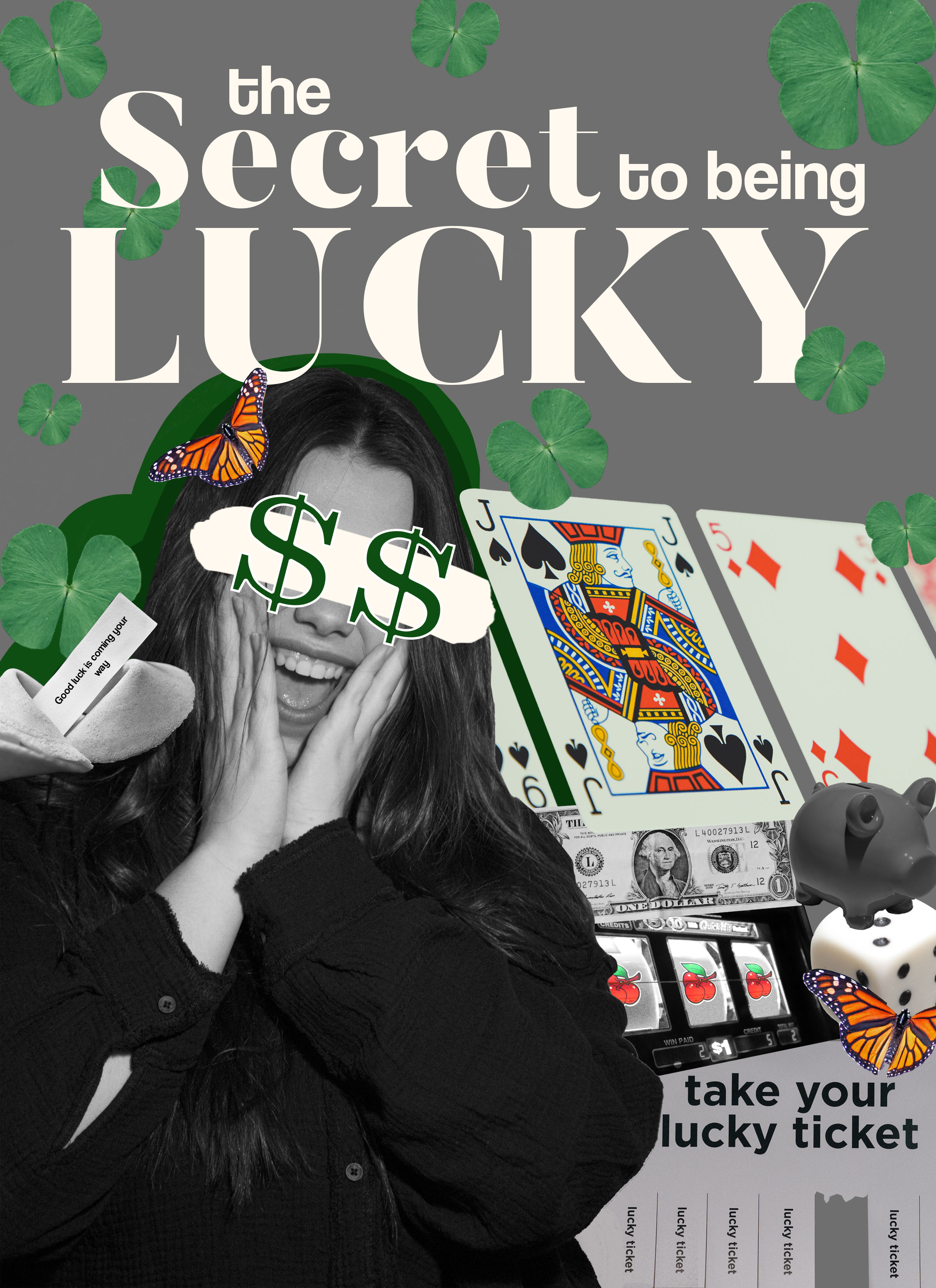 For one of our class projects, we had to create an editorial graphic based on one of several assigned articles. I chose the article “The Secret to Being Lucky”. I decided to take a very straight forward approach and use typical “lucky” symbols. Prof Sue Jenkins recommended that we used our own photos if we weren’t using copyright/attribution free photos from Pexel or Unsplash, etc. I took this direction and ran with it! In fact, I did an entire photo shoot with my very sweet roommate and used it for this project.