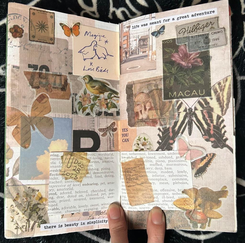 Hello my friends! I hope everyone had a lovely Easter break and enjoyed much deserved time off. Today, I thought we could talk about creative journaling. For those of you who have never heard of creative journaling, it is a type of art making, condensed in a journal, for mental clarity and organization. All you truly need to start this type of journal is the journal itself, a writing utensil, and some sort of glue or tape. Personally, I have a couple different creativity journals. One is solely for lists, such as to do, to buy, to keep track, a bucket list, etc. I decorate it with drawings, magazine clippings, mementos, and stickers. Another one of my journals is for traveling. I keep plane tickets, photos, receipts, and other memories from trips in it. Lastly, I have another journal for miscellaneous things such as drawings, paintings, and collages. This one is the most artistic journal I have.