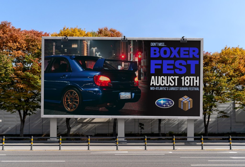 I had never created anything like a billboard before, so I struggle a little with this one. When creating a billboard, you have to create something eye-catching, but also something simple enough that it can be read quickly. Most billboards will only be viewed for a few seconds since they’re usually on the sides of highways. This is something you might not think about if you’re not a designer, or if you’ve never created a billboard before. So, I decided to use a photo of one of their most famous cars, to catch the viewers eye. I then decided the make “Boxerfest” and “August 18th” the biggest elements, in hopes that they would see the date and the event, and search it on the web. “Mid-Atlantics Largest Subaru Festival” and “Don’t miss” are in smaller sizes since they really aren’t that important for the information, just important for the actual design.