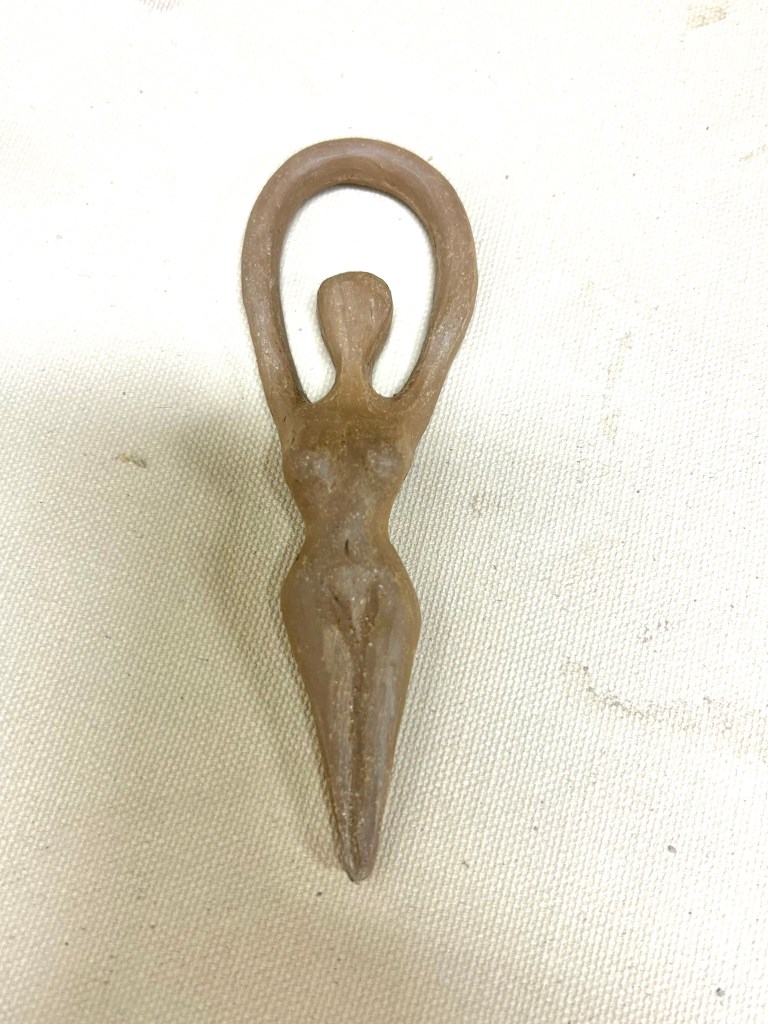 This goddess pendant is the first but not the last, I plan to create a few how I make wall hangings that are small enough to wear around my neck. I want to make a couple so that I can play around with the glazes and find one that I like the most. I made my first one at the end of last semester but she did not survive the firing. I’m hoping this one has better luck. For my next few I want to create some different body types and be inspired by other ancient goddess statues.