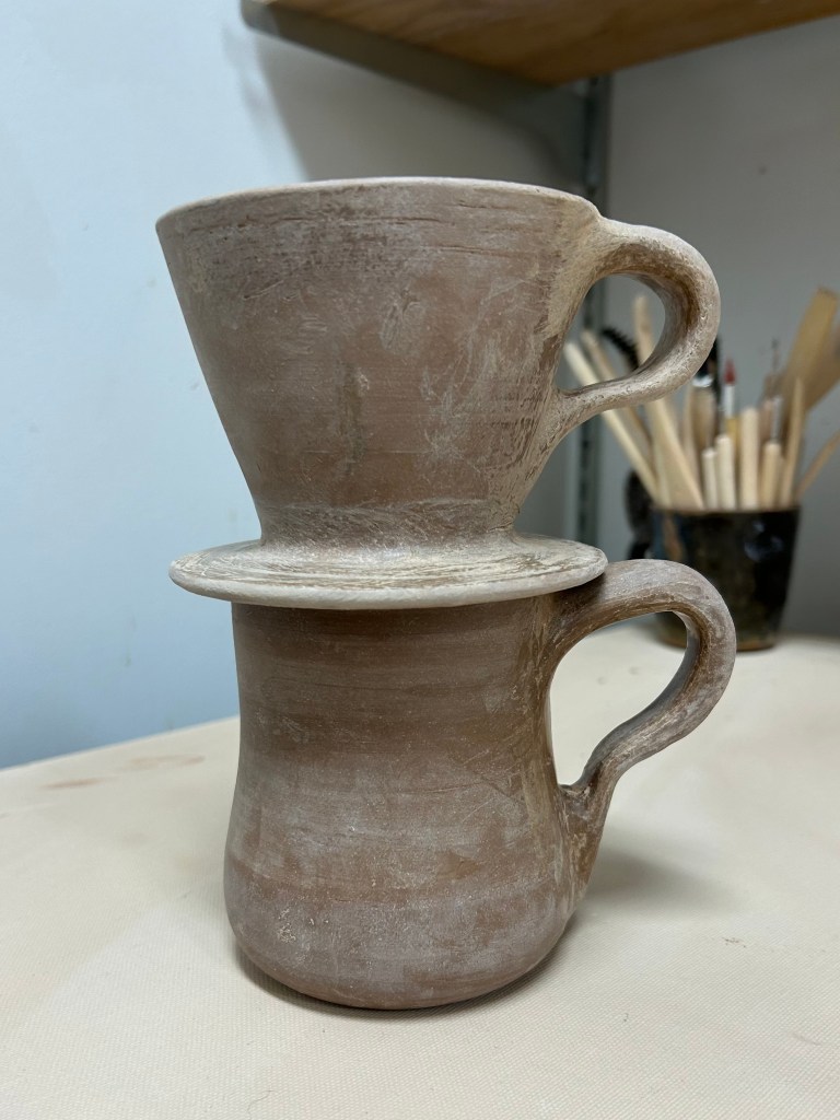 I made a drip coffee cup for my boyfriend and am excited to try it out since I have never made coffee that way! I had 2 main goals: I wanted it to be a decent-sized mug since I have had trouble with my mugs always shrinking more than I expected them in the kiln, and the other goal was to have a comfortable handle. I’ll admit, making mugs is not my strong suit and I’ve made a handful now, none of which are comfortable to use. One of my biggest mistakes then was not thinking about what it would actually be like to drink from. So, this time around I kept all of that in mind and I’m eager to see what it will be like after the bisque firing.