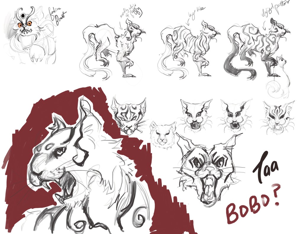 These two characters were the most enjoyable for me to work on. So far, I have completed their spread of poses and will now be working on the protagonist, Thuli. After playing with different layouts for them, I settled on these as my preferred ones. It was quite a challenge to draw the feline body, and I have still yet to be comfortable with the anatomy. Yet I am more nervous about the facial expressions I have to make for them, with only two days left until the critique…I hope I can complete them in time.