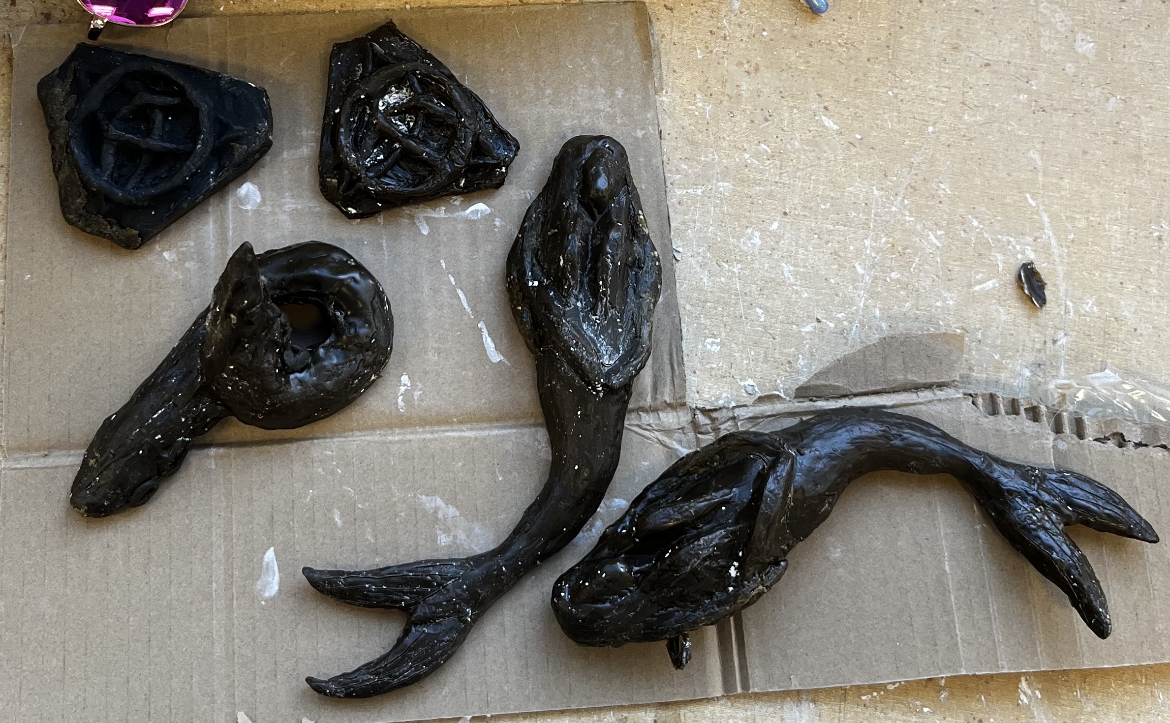 For my pieces I decided on 3 different things: an octopus tentacle, a pair of Irish infinity knots, and a pair of mermaids that will be placed next to each other in a way that makes it look like they’re swimming in a circle. However, I hate working in wax. I find that it cools and hardens way too quickly for me, so I made my pieces out of clay first, and then made a mold of them so that I could pour wax into it. I made a total of 3 molds; 1 for the tentacle, 1 for the mermaids, and 1 for the Irish infinity knots.
