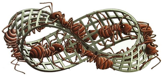 For the first assignment in my Conceptual Design class, we were tasked with creating a pattern that would eventually be transformed into our own 3D version of the M.C. Escher-esque Möbius strip. The first thought that I had was “How do I create a pattern that is unique and interesting to look at without being too repetitive.” I wanted something that would be equally as compelling of a design as the idea of a Möbius strip itself. If you’re unfamiliar, a Möbius strip is known as “the simplest non-orient able surface,” or a one-sided “twisted cylinder” that more or less looks like an infinity look with only one side. For reference, here is Escher’s take on it.