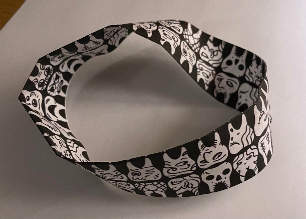 Finally, I finished it by copying the design and duplicating it horizontally, creating an almost fractal-like effect in the design. Once finished, I printed it out, folded it over itself and twisted it to only have “one side” before connecting the paper to form my Möbius strip. This project helped me learn how to develop a fun, interesting and compelling design while also trying to think about how it could seamlessly overlap itself.