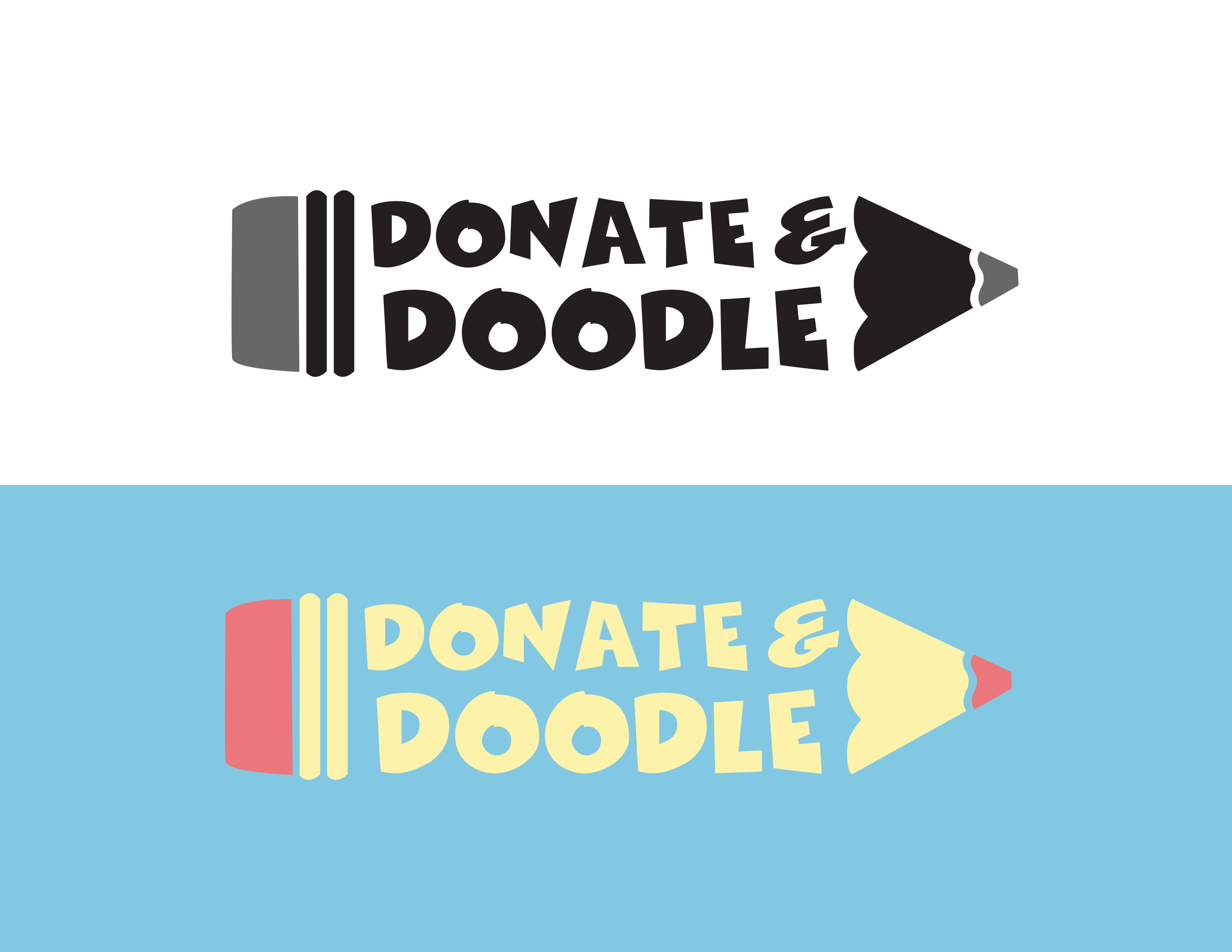 This semester in my Communication and Conceptual Design class with Professor Kevin O’Neil, we’ve been working on developing branding for an organization of our choice. We could either choose an existing group or create our own, and I decided to invent a nonprofit called Donate and Doodle. The idea is to collect school and art supplies and host creative events for kids who might not otherwise have the resources to make art. I picture the organization having physical spaces for events, sending volunteers to schools and hospitals, and even donating directly to teachers who need classroom materials.