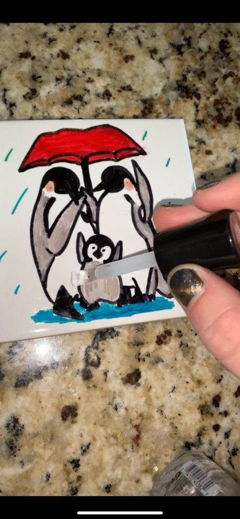 The next step after they’re fully baked and dry, I top the drawings lightly with clear top coat nail polish. I haven’t had a problem with any of the designs coming off after I used that, but again, lightly put it on so there’s no chance of it smearing.