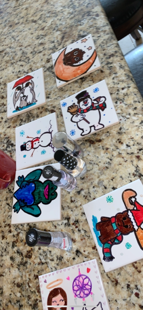 These ceramic coasters are simple tiles I bought from Lowe’s in bulk! They are inexpensive and fun to draw on!