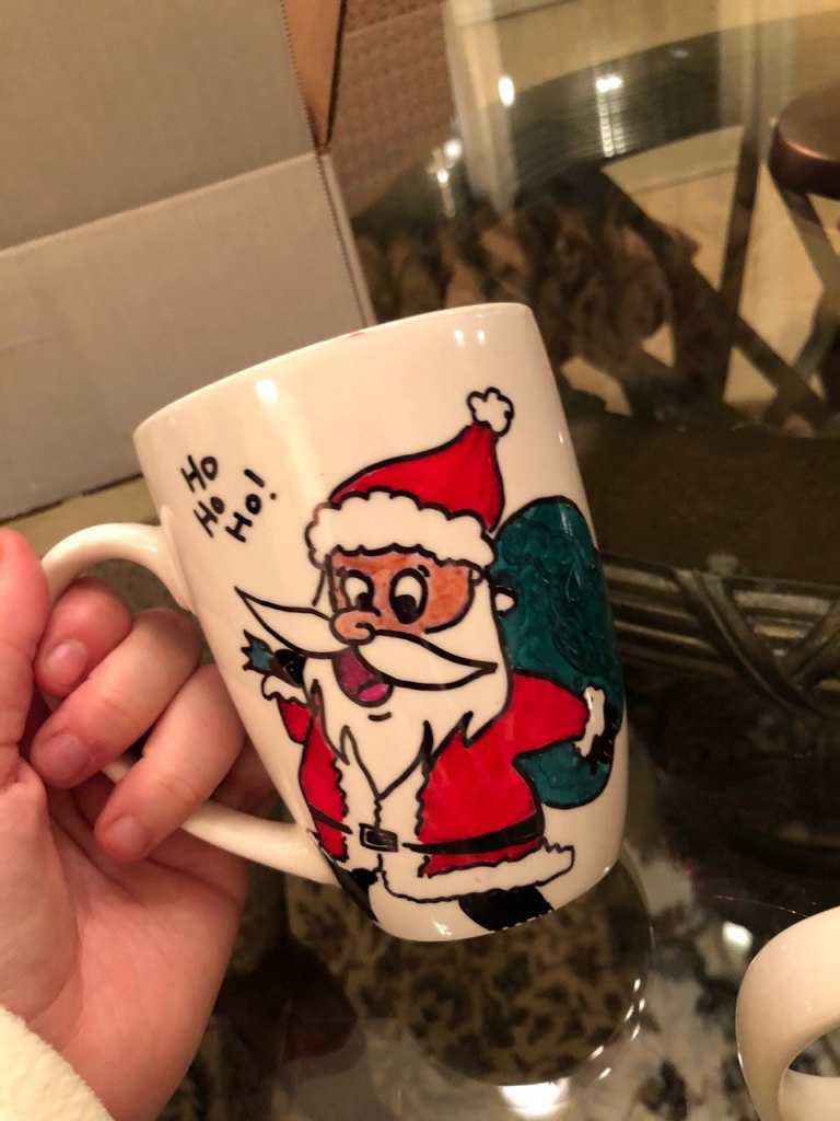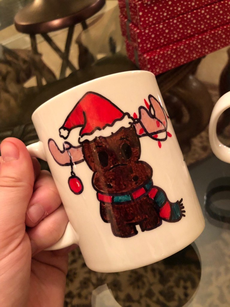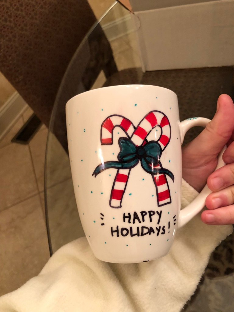 The possibilities with making a mug for someone are endless – you can make the designs meaningful for yourself or for whoever the mug is going to. In my set, I gave holiday mugs with designs I found online with mugs I bought at Walmart for 99¢!