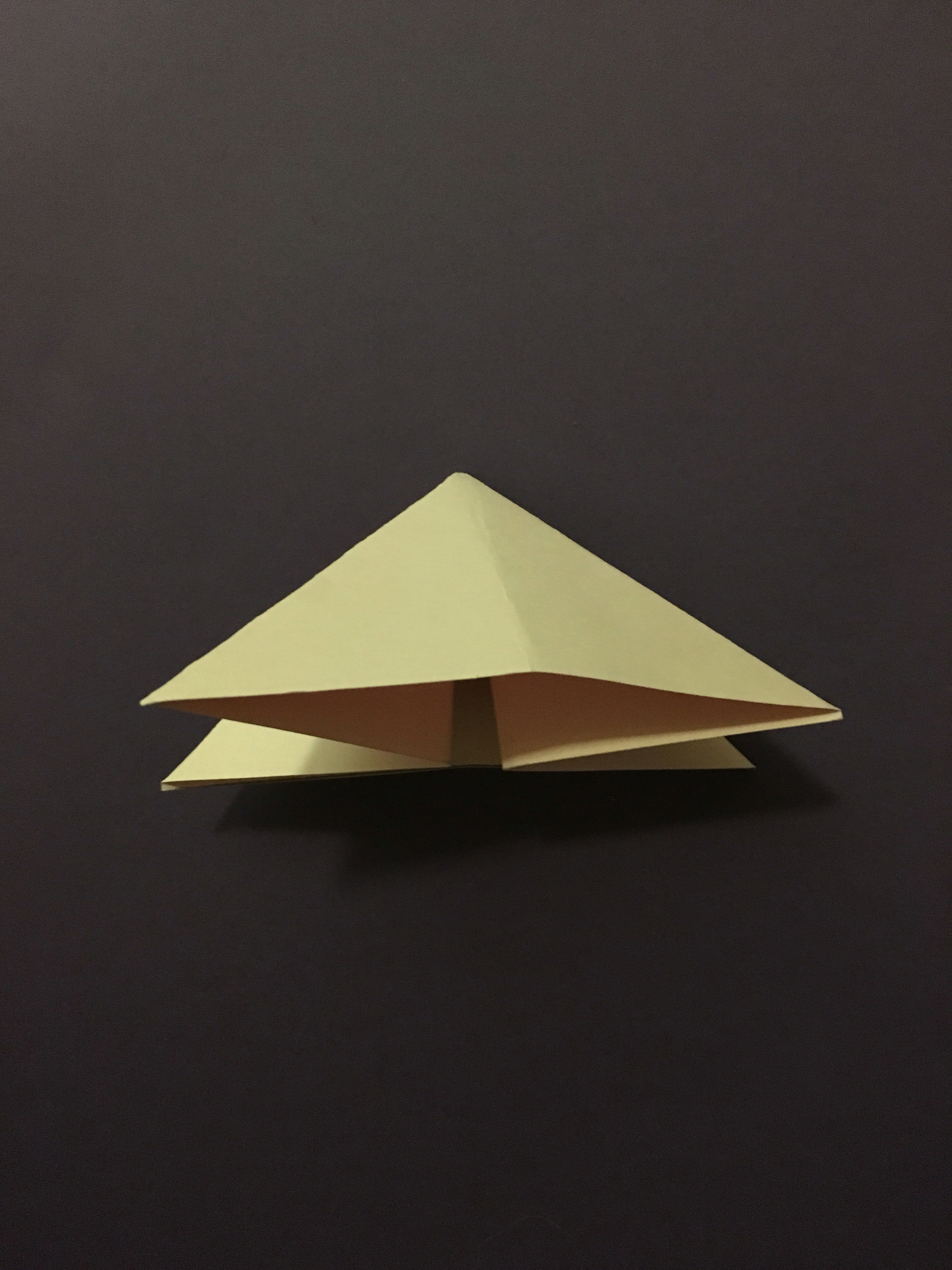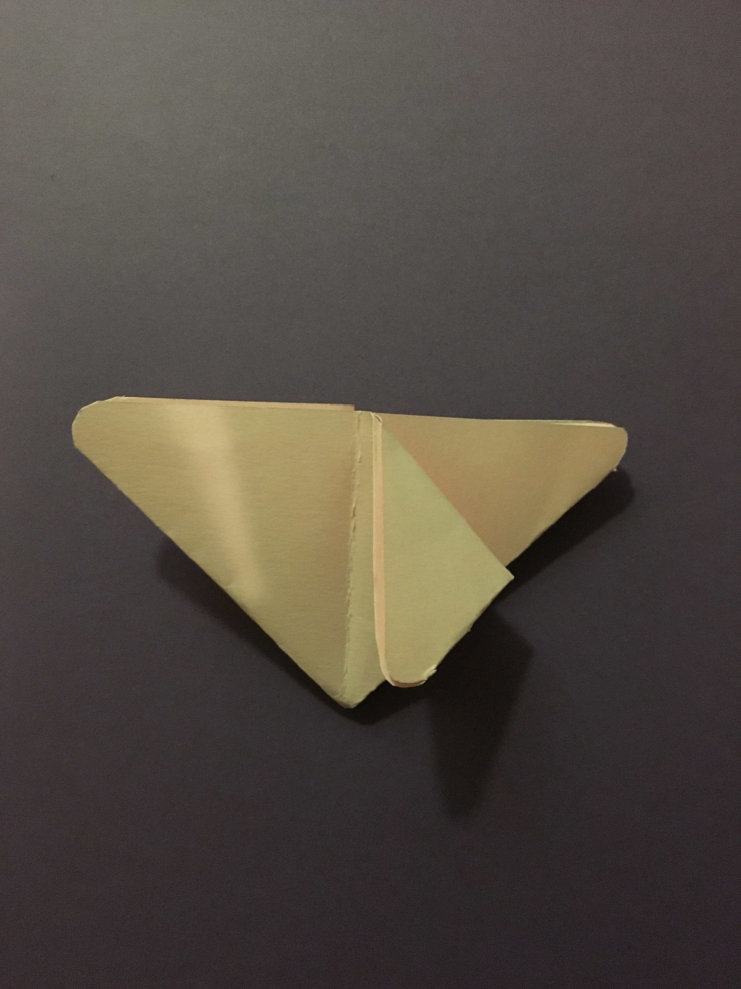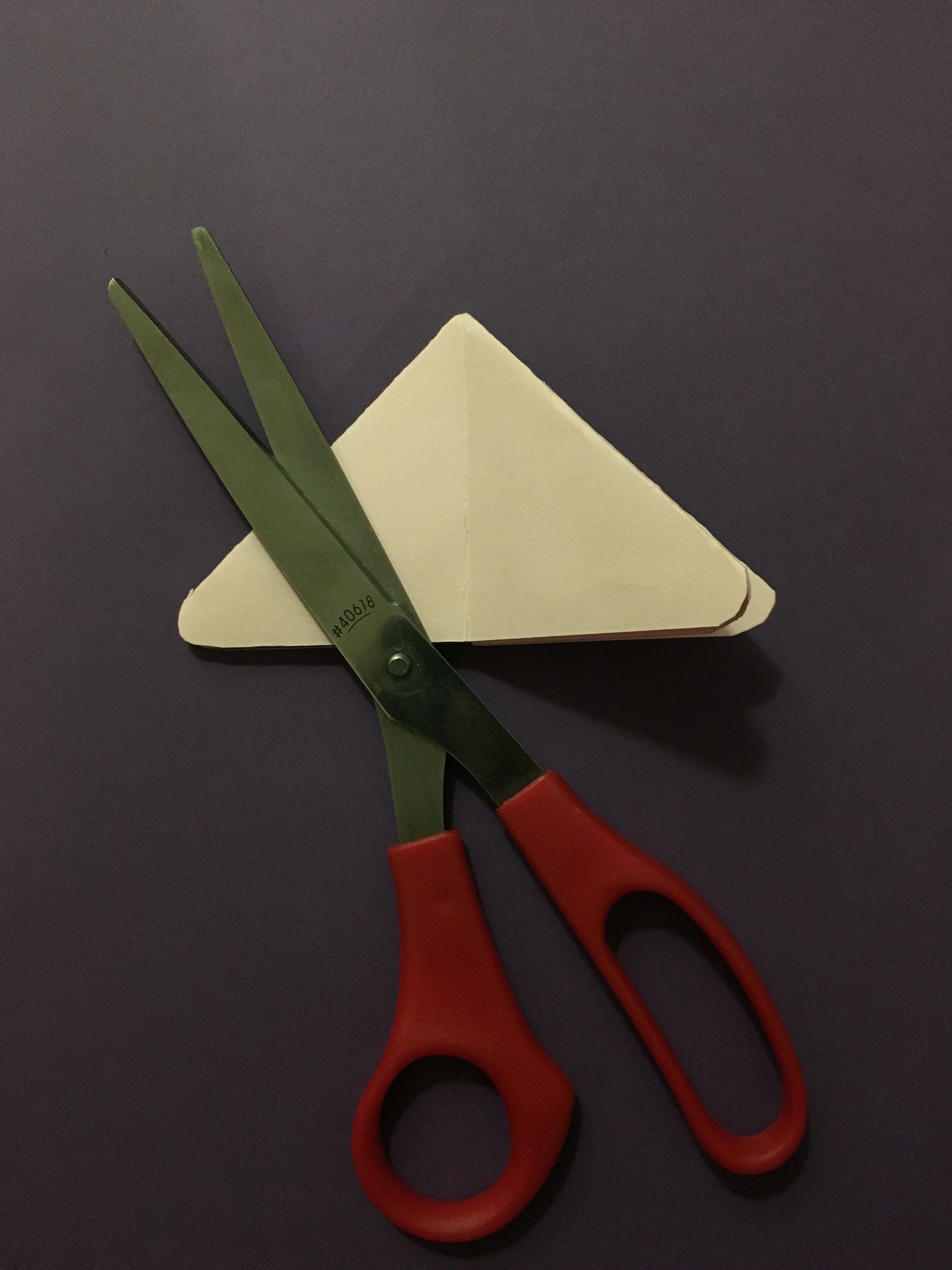 Now you’re going to want to push in the corners on either side of the rectangle which should leave you with a triangle. Next, make the two bottoms corners of the triangle rounded by cutting them.