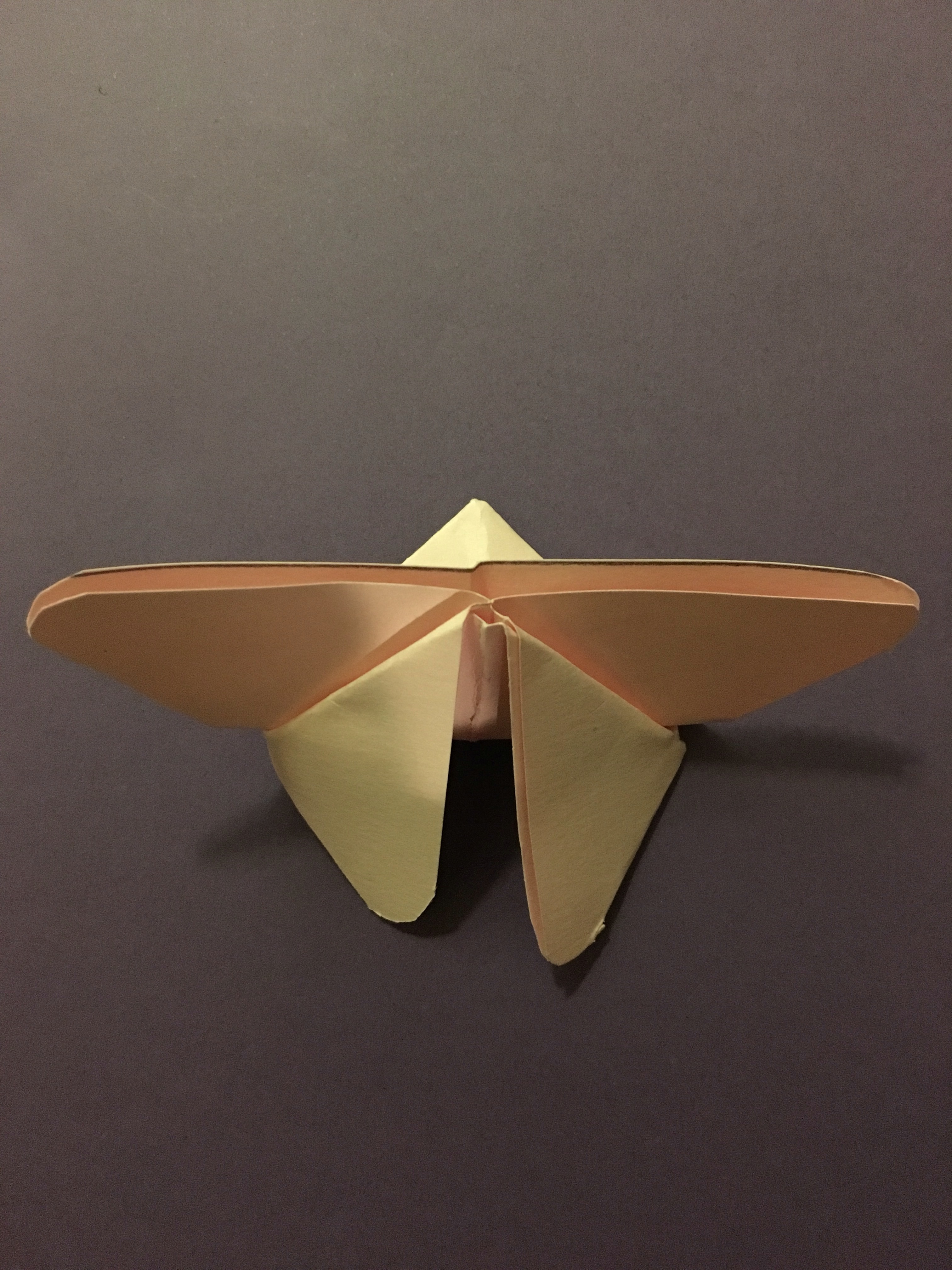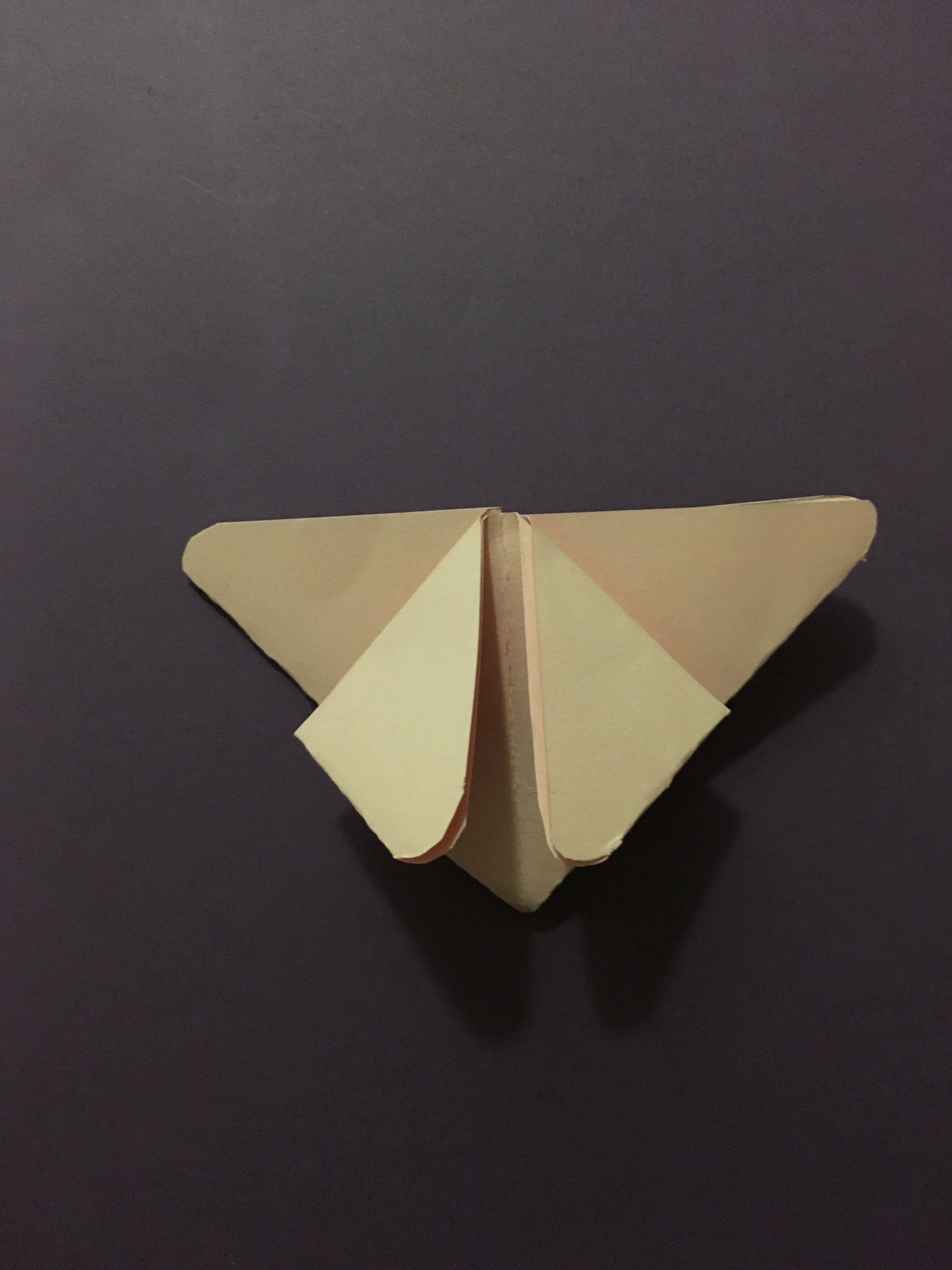 For this step, you’re going to turn the triangle so that the pointed part is facing toward you. Next, take the corners of both sides and fold them along the middle crease of the triangle. The corners you just folded will be the bottom halves of your butterfly wings. Then, take the point of the triangle, facing you, and bend it around the back. The tip should just make it over the top of the butterfly. Fold the tip over the front and push the top wings together to give it a V shape.