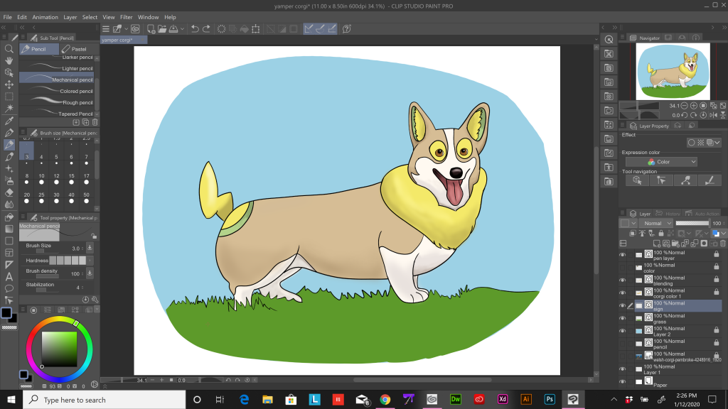 I started out by sketching the dog with a corgi reference from Pixabay. I used the pencil tool to make the sketch, I like this tool for all of the different types of pencils you can draw with.