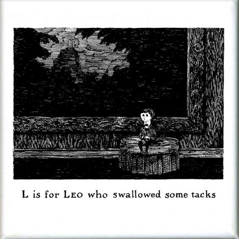 Image: https://goreystore.com/products/edward-gorey-l-is-for-leo-who-swallowed-some-tacks-square-magnet