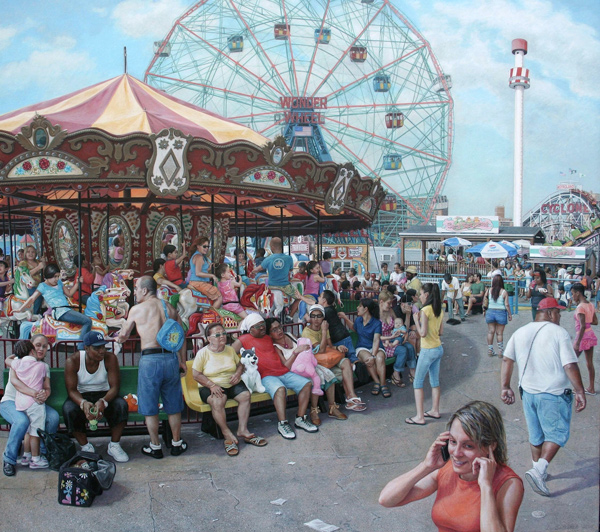 Safranek’s paintings of Coney Island are particularly amazing. In The Brass Ring, pictured here, the attention to detail is nothing short of extraordinary. Each individual person has their own unique expression. The clothing shown has wrinkles and patterns, even those in the background. Safranek was even sure to include the mirrors on the carousel! The detail is especially amazing considering that the medium requires small, layered strokes. Plus, the painting is not very small – it’s about 18” x 21”. The painting truly puts you at an amusement park and allows you to feel the excitement of the day.