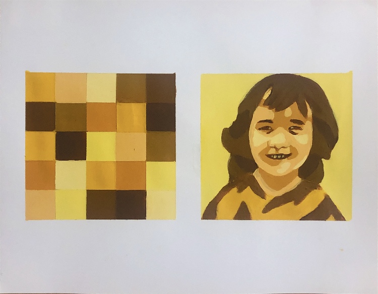 This first piece is from my first semester 2D Design and Color class with Dennis Corrigan. We were supposed to pick one color and pre-mix ten variations of that color using acrylic paint. He wanted us to use these to paint a figure using shapes, as well as create a grid of the colors next to the figure. I chose to paint my niece, and chose yellow because it represents happiness. I really love this one because I love that I was able to capture her lively, happy energy while basically using one color. I also think it’s cool that I could represent the features of the face using shapes and blocks of color, which is not something I usually do.