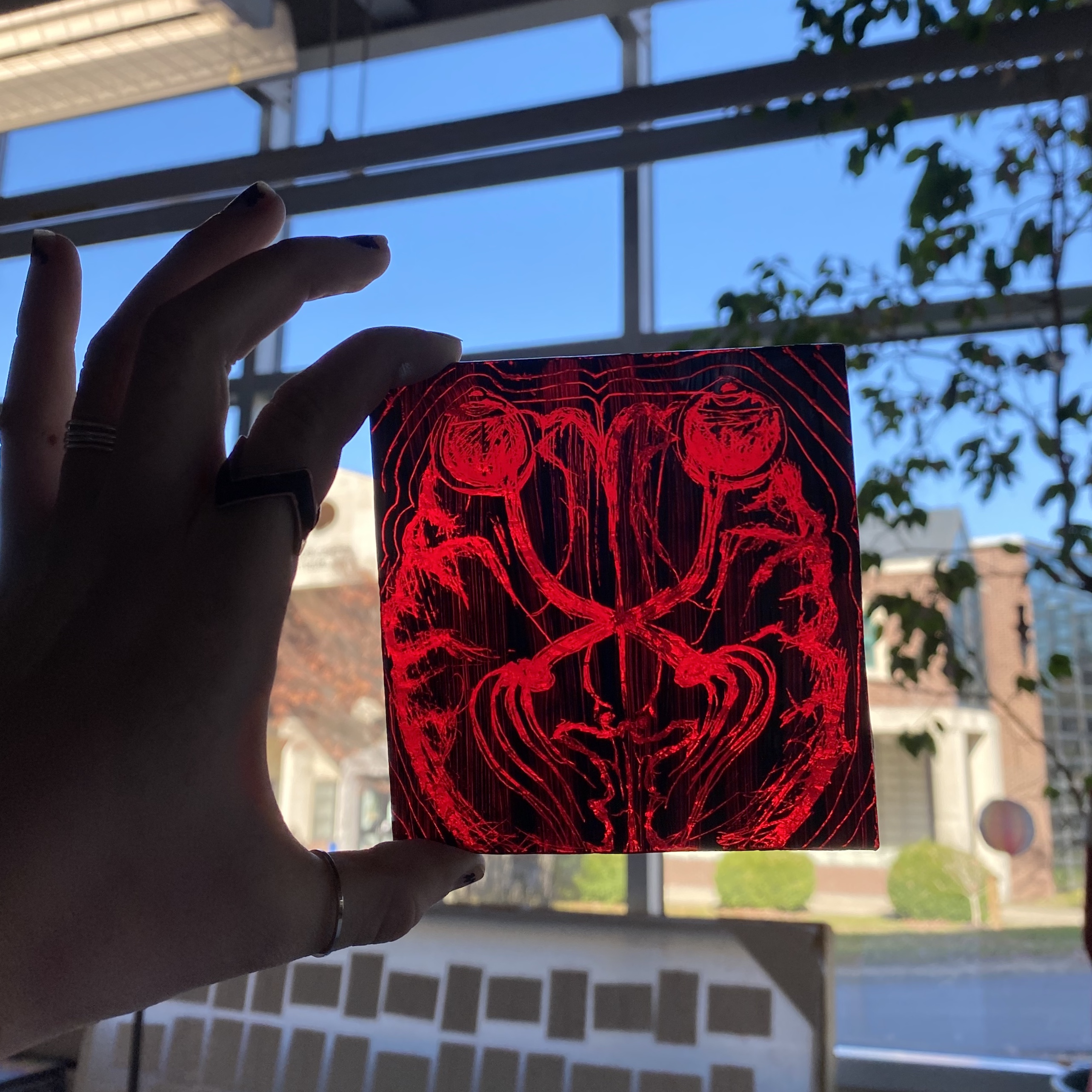 To do this, I cut a piece of glass, clean it, and brush on an opaque layer of black paint. When mixed with water and a touch of gum arabic, the paint will be resistant to rubbing off but will maintain a perfect texture to scrape off clean lines with a toothpick. Sharpening the ends of one of my brushes created the perfect tool to work with. A light table is a necessity for painting glass in order to ensure the paint is the correct thickness and to manipulate the amount of light showing through. Once the etching is completed and the excess is gently brushed away, the glass is ready to fire.