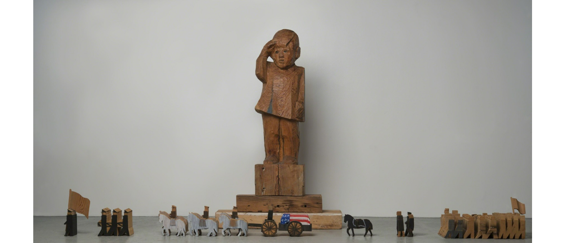 One piece on view that stood out to me was The Funeral, 1996, made of paint, crayon, and oil on wood. It depicts former President John F. Kennedy’s funeral procession with a large sculpture of JFK Jr.’s famous salute behind it. She thought this moment was incredibly impactful and that it was important to draw attention to it.