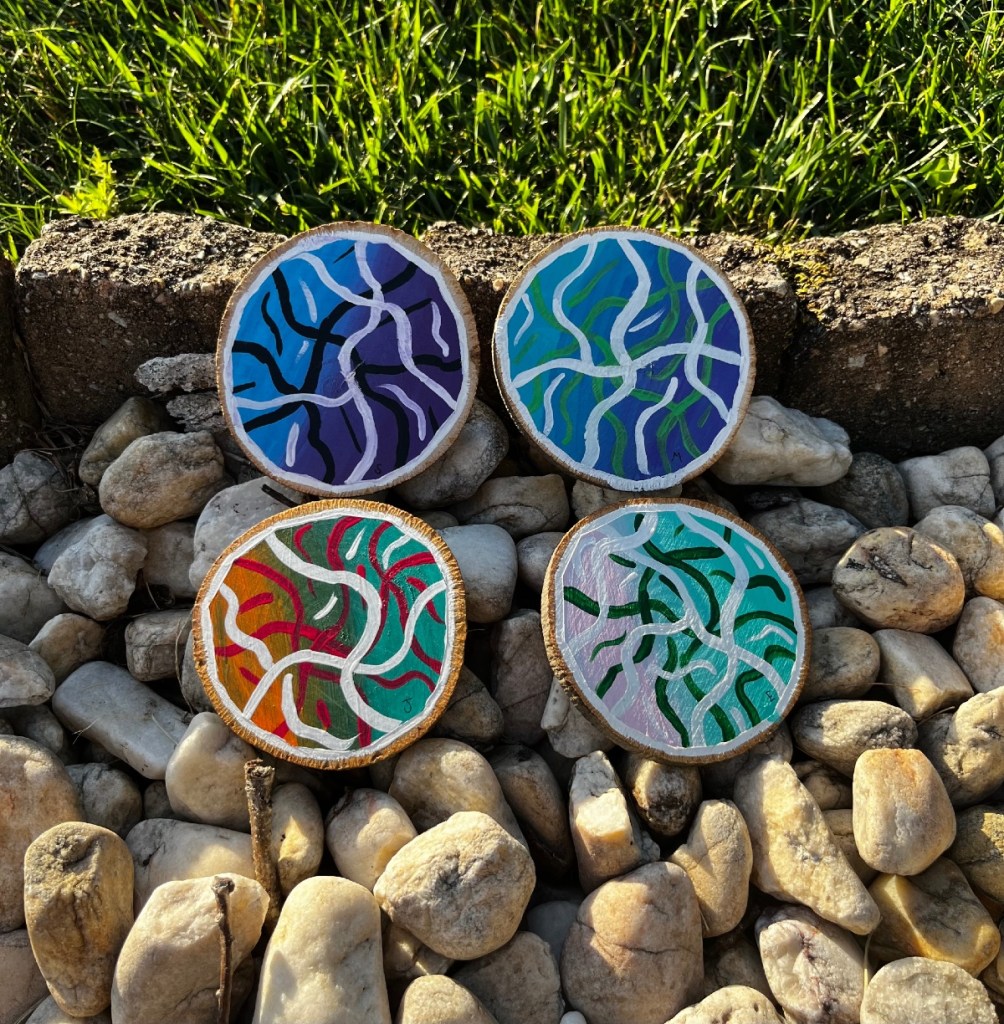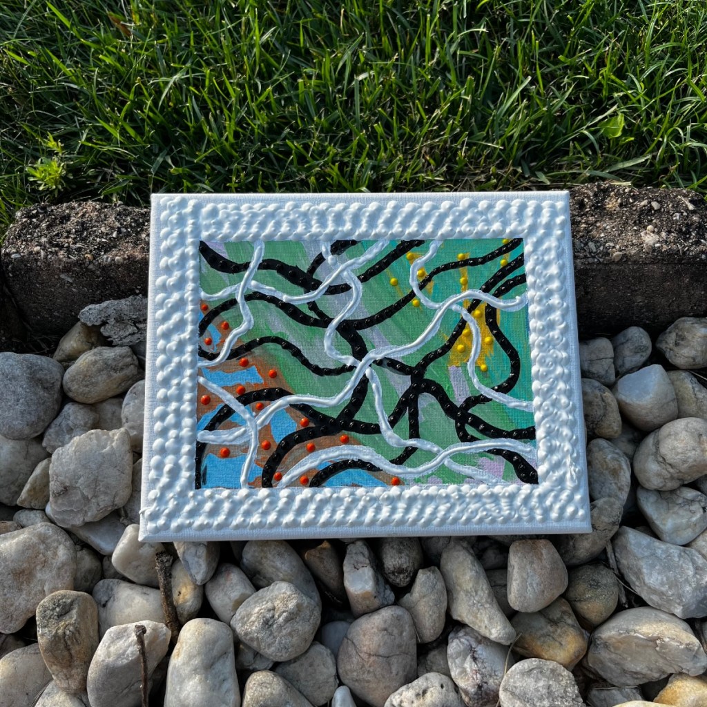 I’ve painted 3D materials like wood and clay. I have also been finding ways to make my regular paintings on canvases have 3D aspects to them. One thing I’ve tried that I really like is after making a painting I’ll add Puffy-paint to the canvas to give it a 3D aspect. I find it to be a really fun thing to add that creates a really interesting look and a really nice texture. I also really like the way the puffy-paint feels on the canvas.
