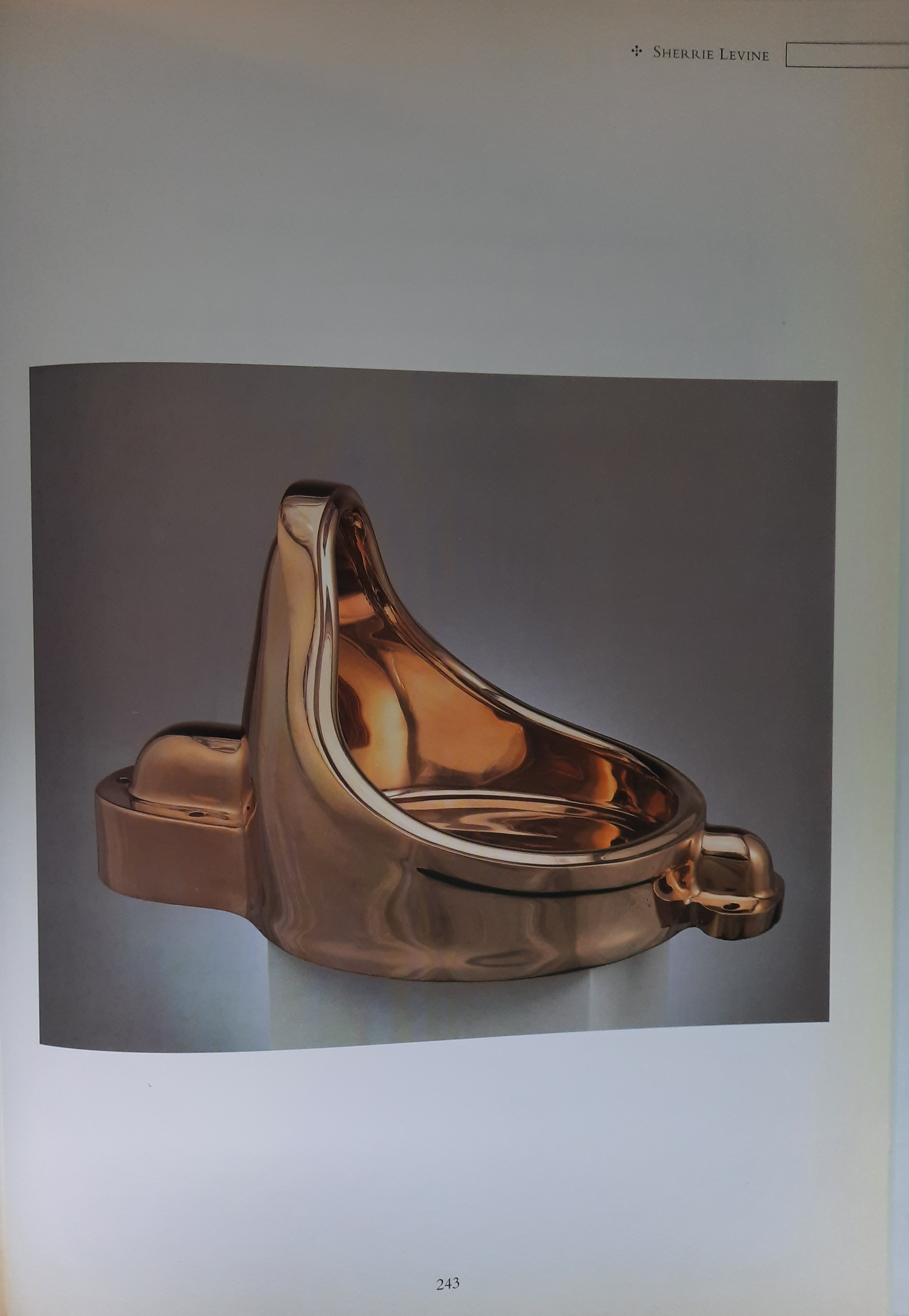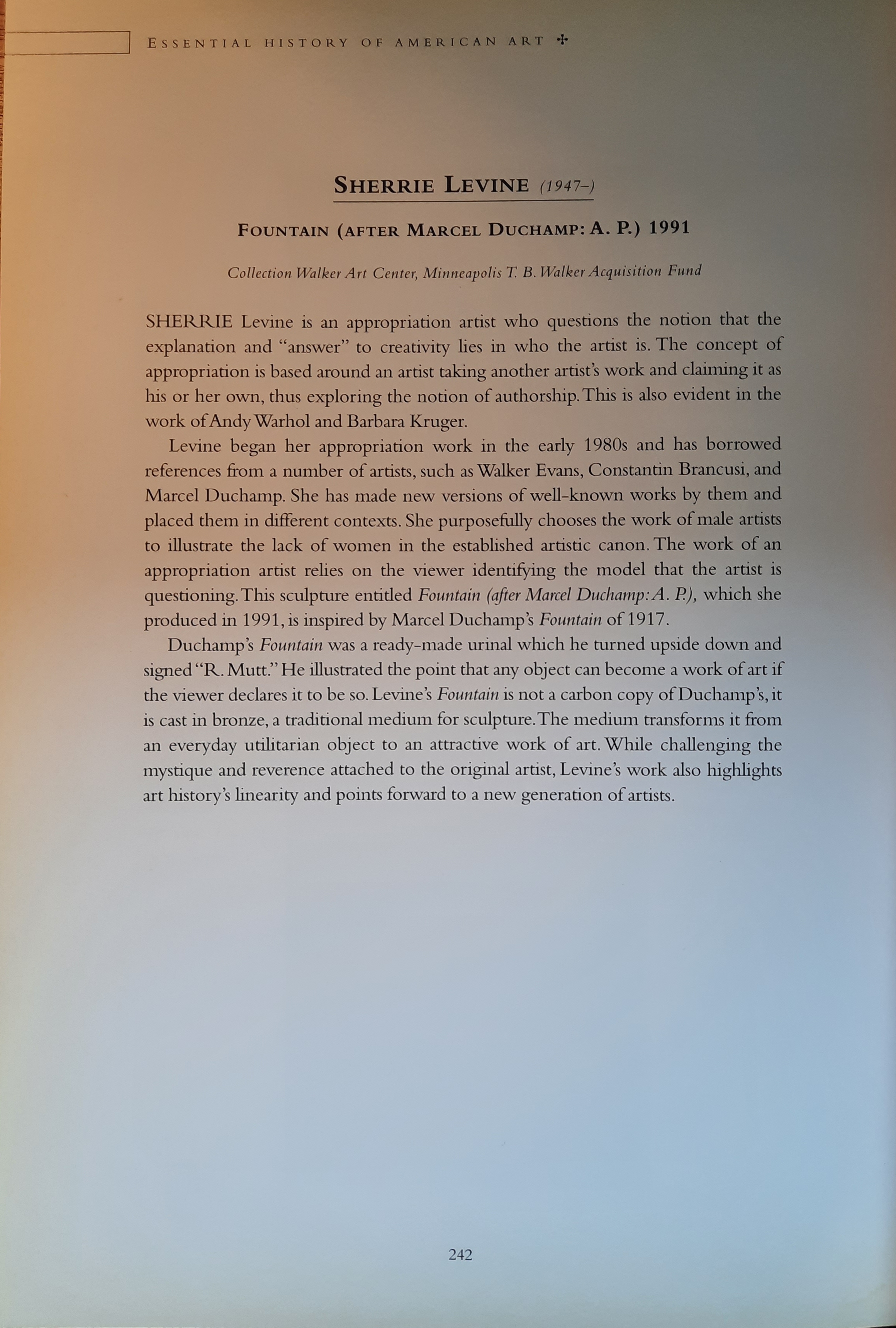 What I love about this piece by Sherrie Levine is that it is a play on the previously mentioned Marcel Duchamp’s Fountain, which I will always have a soft spot for because I had to argue why it was or wasn’t considered Art in my Art 101 class at Lackawanna College, and it has just stuck out to me as an artwork in general. Although the book says everything needed to be said about the piece, I do think that it offers a different perspective on an already thought provoking piece, and the way in which Levine managed to give new life and meaning to the work will forever amaze me.