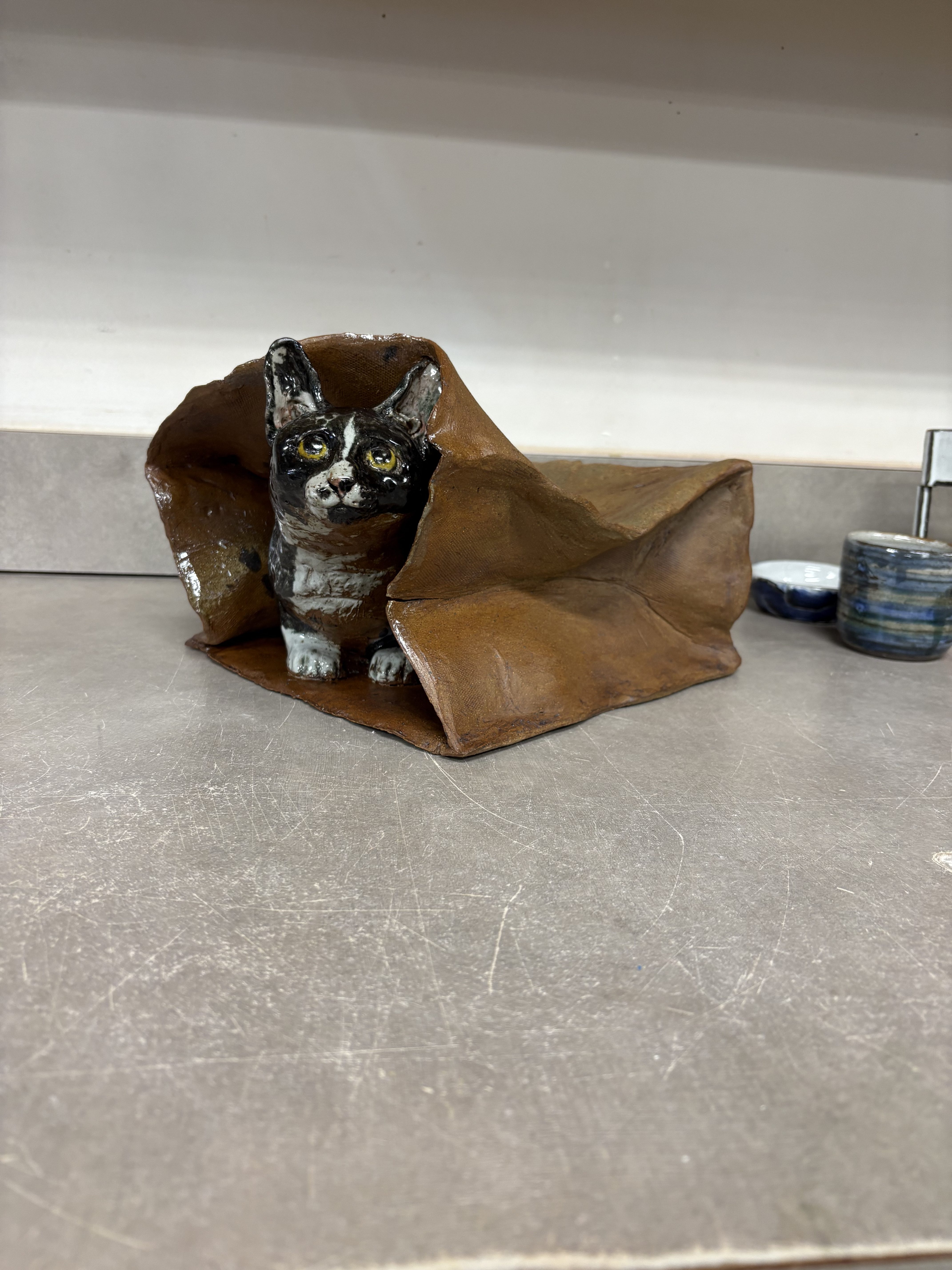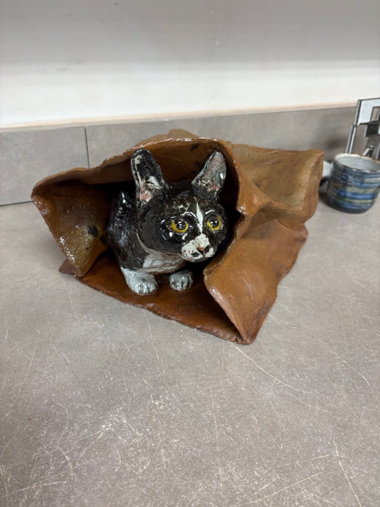 Here’s the final kitty piece, I’m, overall, pretty happy with how the glaze turned out. I’m glad the bag turned out decently realistic. I brushed the bag with iron oxide to get a bit more dimensionality than the plain clay color. I sprayed the cat, and the inside of the bag inadvertently, with white glaze. I then wiped out the overspray that hit the bag, and painted on black underglaze according to my picture reference of my cat. I then sprayed it with a little bit of clear to prevent crawling. I think the final effect works well, although, in retrospect, I almost wish the cat were more matte. Not much I could have done to achieve that, though.