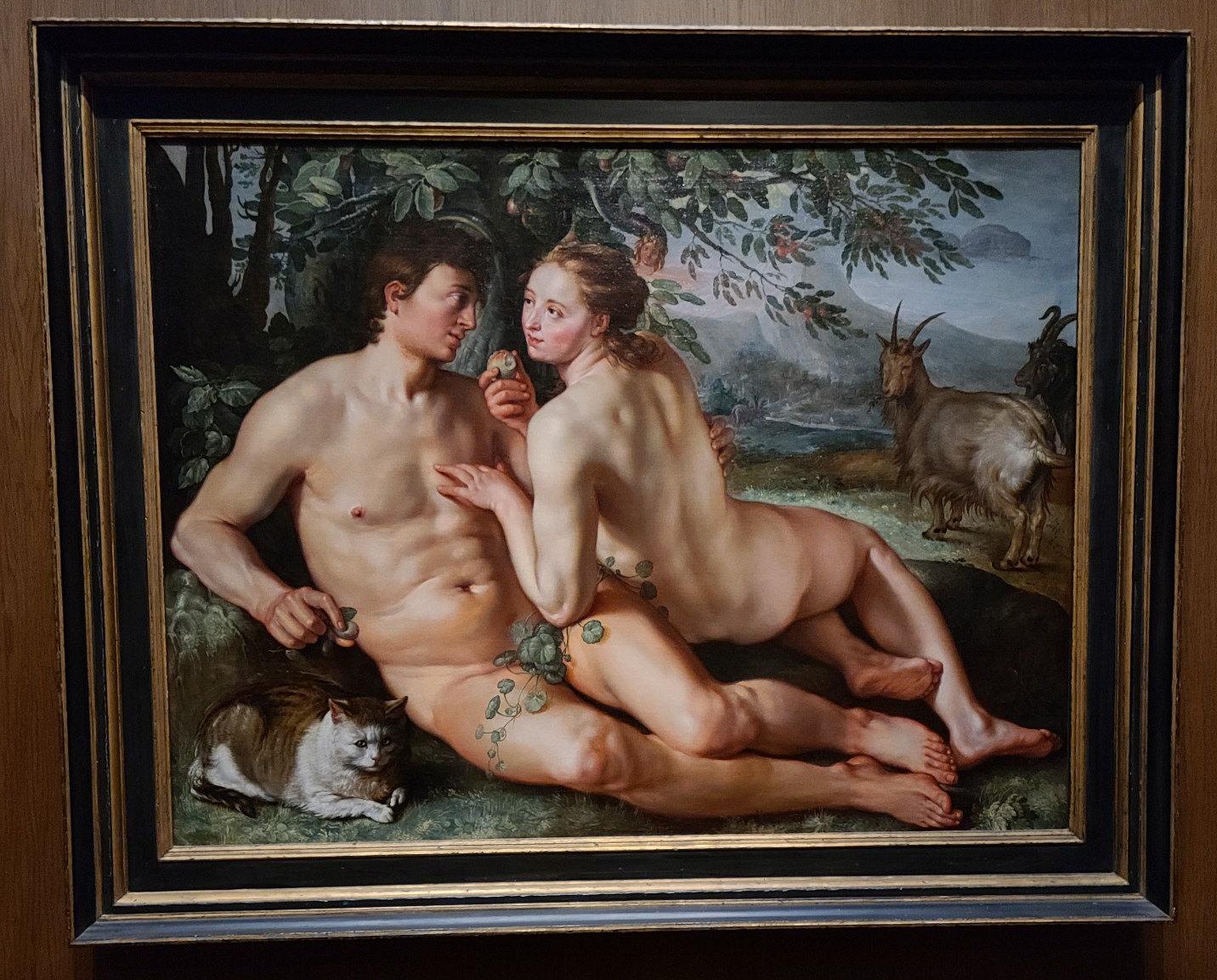 My favorite piece I saw that day was an interpretation of the fall of man, which was appropriately called The Fall of Man. It was made in 1616 by a man named Hendrick Goltzius. It was not unlike Goltzius to have work featuring the human form but this piece is unique because of the inclusion of a cat. Despite the narrative around the fall of man being about Adam and Eve, it is the intense stare from the cat that caught my attention. Here is a recreation of my reaction to the piece: Oh I think that’s Adam and Eve. Wait, what’s that little guy in the left corner? A cat? Who’s looking directly at me??
