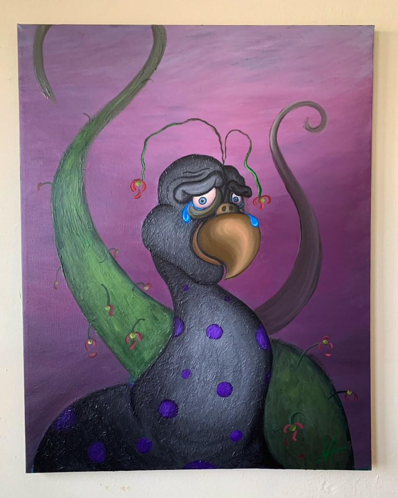 This piece was the most difficult I have made in a very long time, perhaps the most difficult one I have ever made. I very much labored over this one to get what i had in my head onto canvas, I wanted to put my own twist on an otherwise very important and recognizable scene, a scene that may have been recreated more times than any other biblical story in history. I don’t really like going in depth when explaining this piece so all ill say is that I wanted to marry the emotions of suffering and joy together. This painting was also difficult on the account of the emotional effects it had on me, its a pretty brutal thing to look at for hours on end multiple days a week. It was a lot on my soul, which is the reason I decided to go back to my roots a bit with the final piece of the semester.