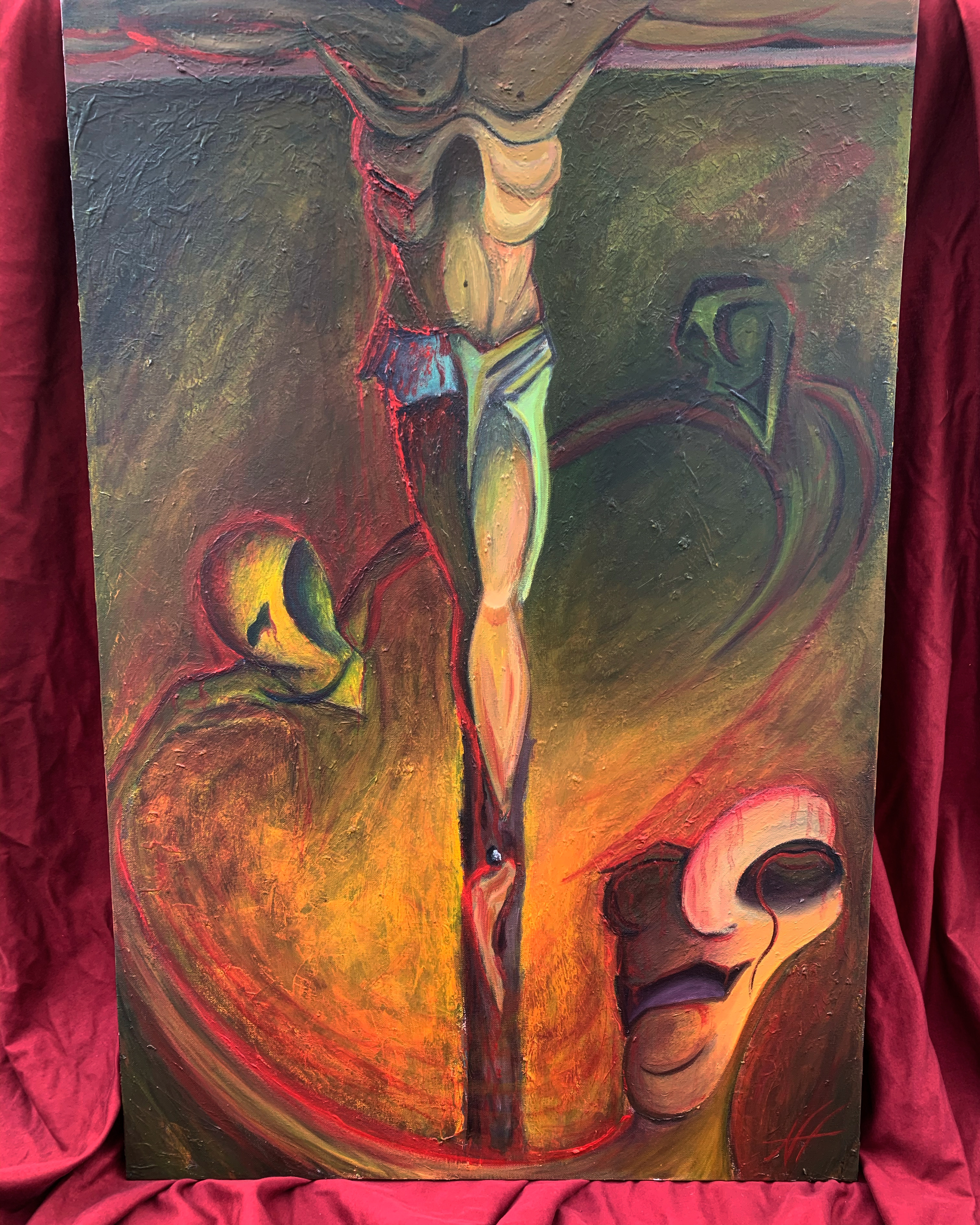 This piece was the most difficult I have made in a very long time, perhaps the most difficult one I have ever made. I very much labored over this one to get what i had in my head onto canvas, I wanted to put my own twist on an otherwise very important and recognizable scene, a scene that may have been recreated more times than any other biblical story in history. I don’t really like going in depth when explaining this piece so all ill say is that I wanted to marry the emotions of suffering and joy together. This painting was also difficult on the account of the emotional effects it had on me, its a pretty brutal thing to look at for hours on end multiple days a week. It was a lot on my soul, which is the reason I decided to go back to my roots a bit with the final piece of the semester.
