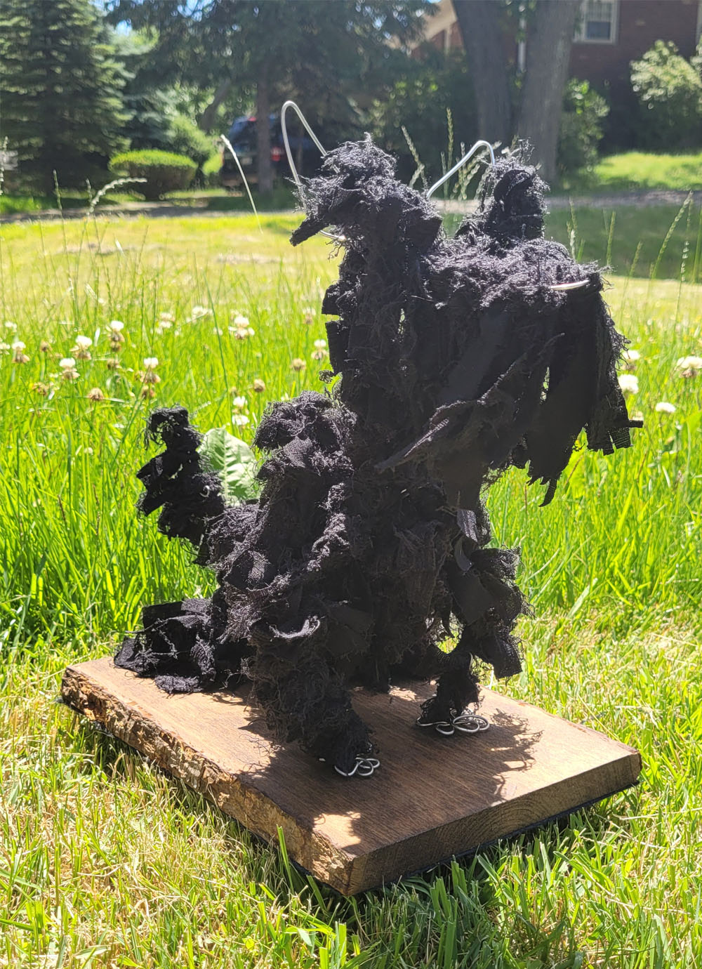 There’s a moment where you begin to feel like a project is working out. Once I knew that I wasn’t going to have any structural, I was able to enjoy the quiet of knotting the fabric and getting the shape just right. This is modeled after my late childhood dog, a sassy lady with a greying beard and excellent eyebrows!
