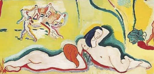 One of the pioneers of this style is Henri Matisse. He was influenced by African art which can be seen in his work. One of his work that I very much appreciate is Le Bondheur de Vivre or Joy of Life, 1905. This is a large scale landscape painting filled with nude figures. There is a bright colored forest, meadow, sea and sky in this work. The nude figures appear to be both in motion and at rest. When this work of art first appeared in the Salon des Indépendants it was a major shock to viewers. Critics were not in favor of the new styles bold choice of color and outlined figures in the landscape.