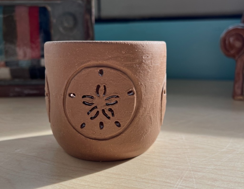 Firstly, for those of you who read my blog post about my glazing experiments, you’ll recognize a bit of a pattern here. This piece uses a pottery technique called devil’s work, where you cut through the walls of a pot to make designs. Devil’s work takes a lot of time and attention to detail to succeed, but the results are worth the tedious process. I wanted to try this sand dollar pattern because I’ve already painted it on a pot and thought carving it would be a good challenge. A challenge it was. The details were so small, and one wrong move could have ruined everything. Luckily, I left an afternoon open to work on it and achieved a piece I think is very successful, especially with this being my first time using this technique. There’s a good chance I’ll do this pattern again, especially if my mom tries to steal this piece!