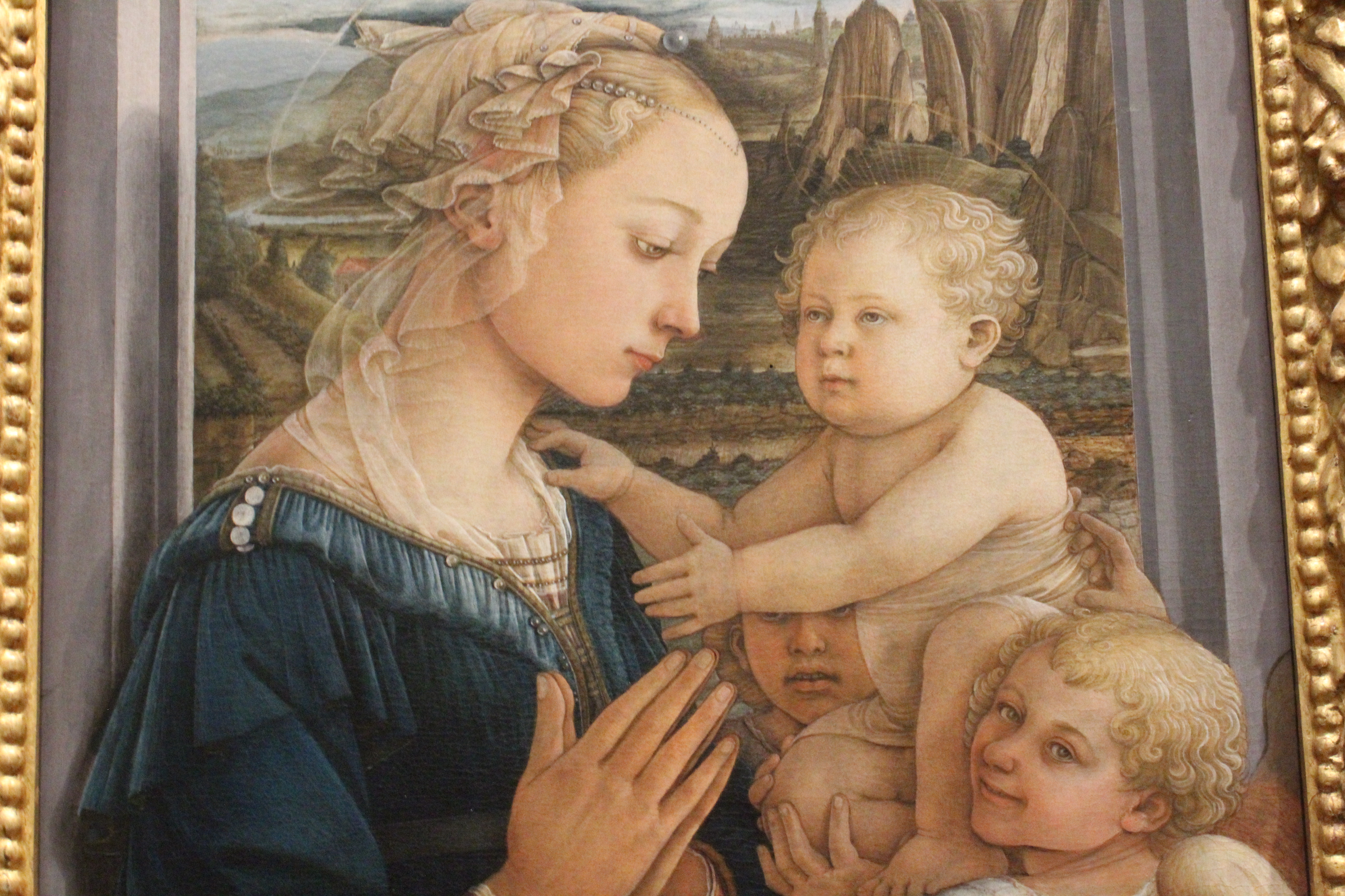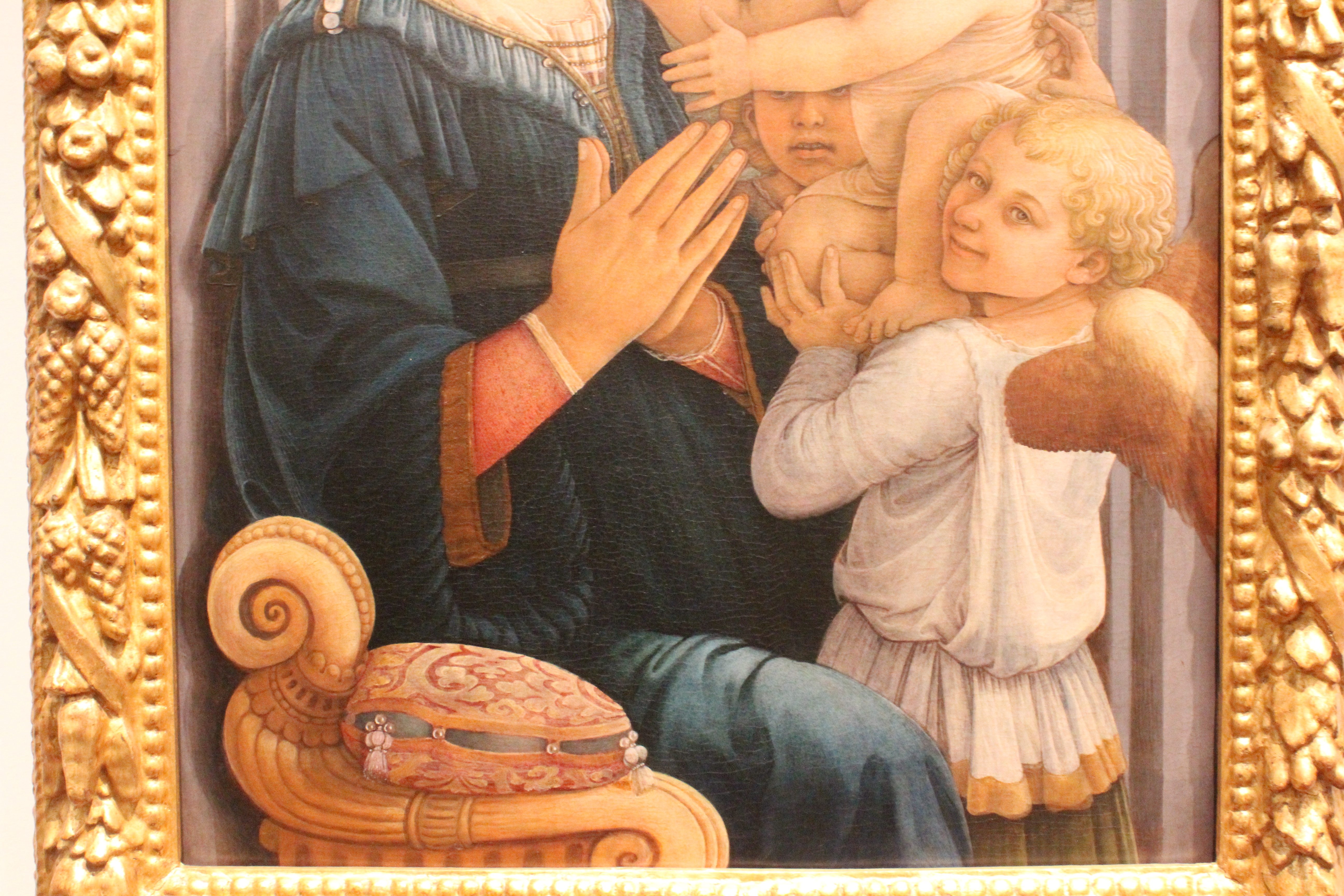 The painting is focusing on Mary with Christ. Here Mary appears to be in prayer, and she is sitting on a elaborate chair, which we only see one arm of. Christ is being held by up two angels. He appears to be going towards his mother, as though he wants her to pick him up. One of the angels is behind Christ and hard to see, and the other angel is in front, engaging with the viewer. He is specifically smirking at the viewer, which adds a cute element to the painting; it breaks the barrier between the painting and the viewers. Therefore, this painting as a background that is interrogated into the painting, but separate from the figures. Then the figures are before the background, so they are in their own space. And then, Lippi drags the viewer in through the angel that looks directly at the viewer. In general, Lippi is creating multiple layers to this one painting.