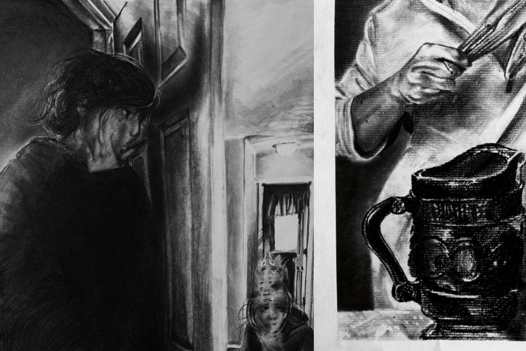 I made the piece below a little early, finishing it on 12/29/25. “Floor Plan”, 30 x 22” charcoal and pencil on paper. Not too happy with it honestly but I blame my shaking hands and the ruler I didn’t use because I left it in my dorm room. But I had fun working on this piece and was able to get a decent background in there, so that’s good enough for me!