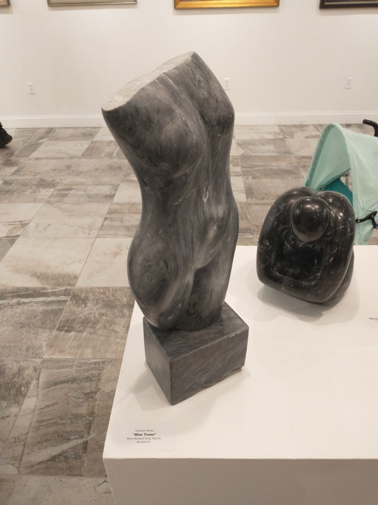 Charles Welles is able to create simplistic, round marble pieces that resemble human movement and shape. Using different kinds of marble and marble colors, he was able to draw me in immediately. Each of these pieces are going for $2,800, although the white figure went for $2,200 and was sold.
