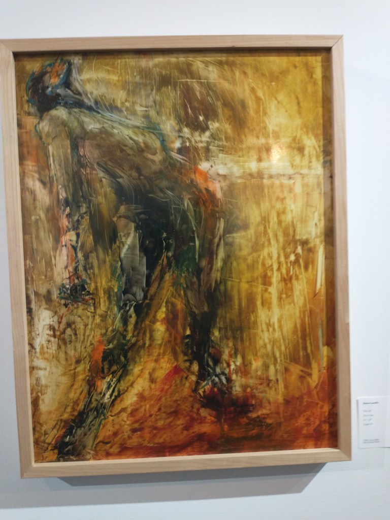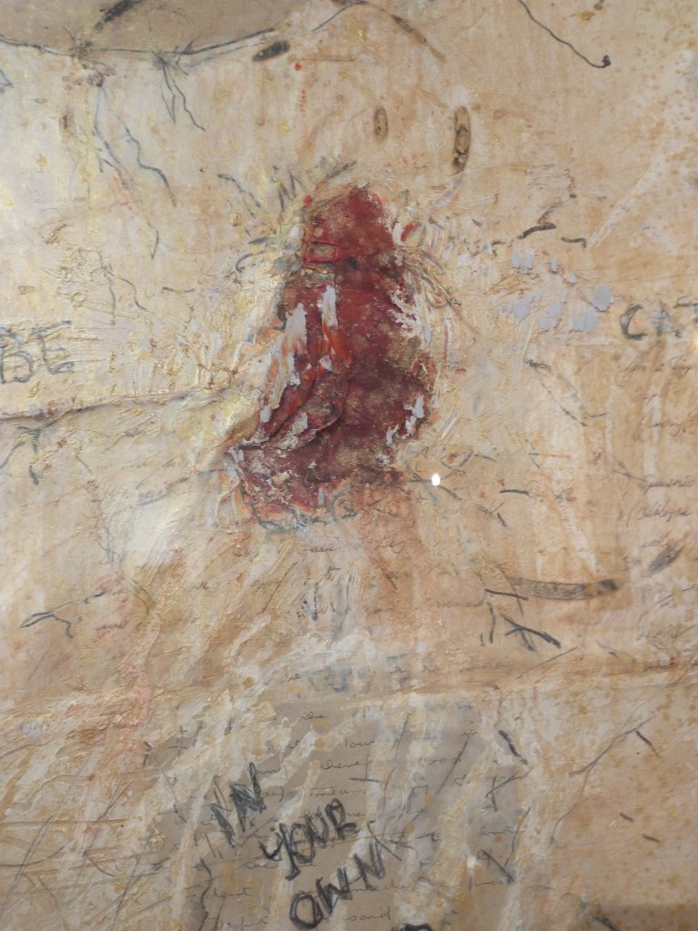 This amazing piece is made with oil, pencil, wax, and collage pieces and is well named “Written in Our Own Hand.”